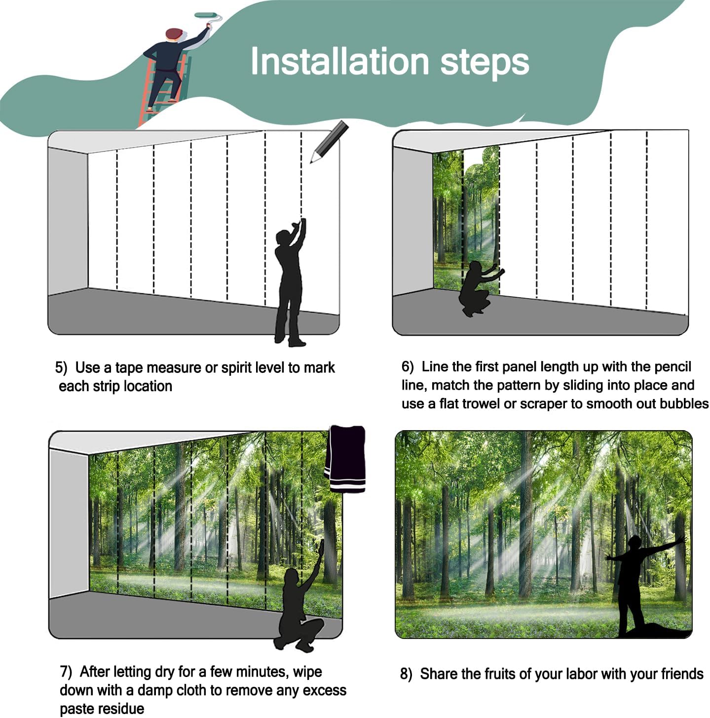 • Mural wallpaper size: 100 "W x 65 "H, divided into 5 sections, each section is labeled with a number underneath, there is no need to overlap the pattern when installing, just install according to the number labeled underneath the panel