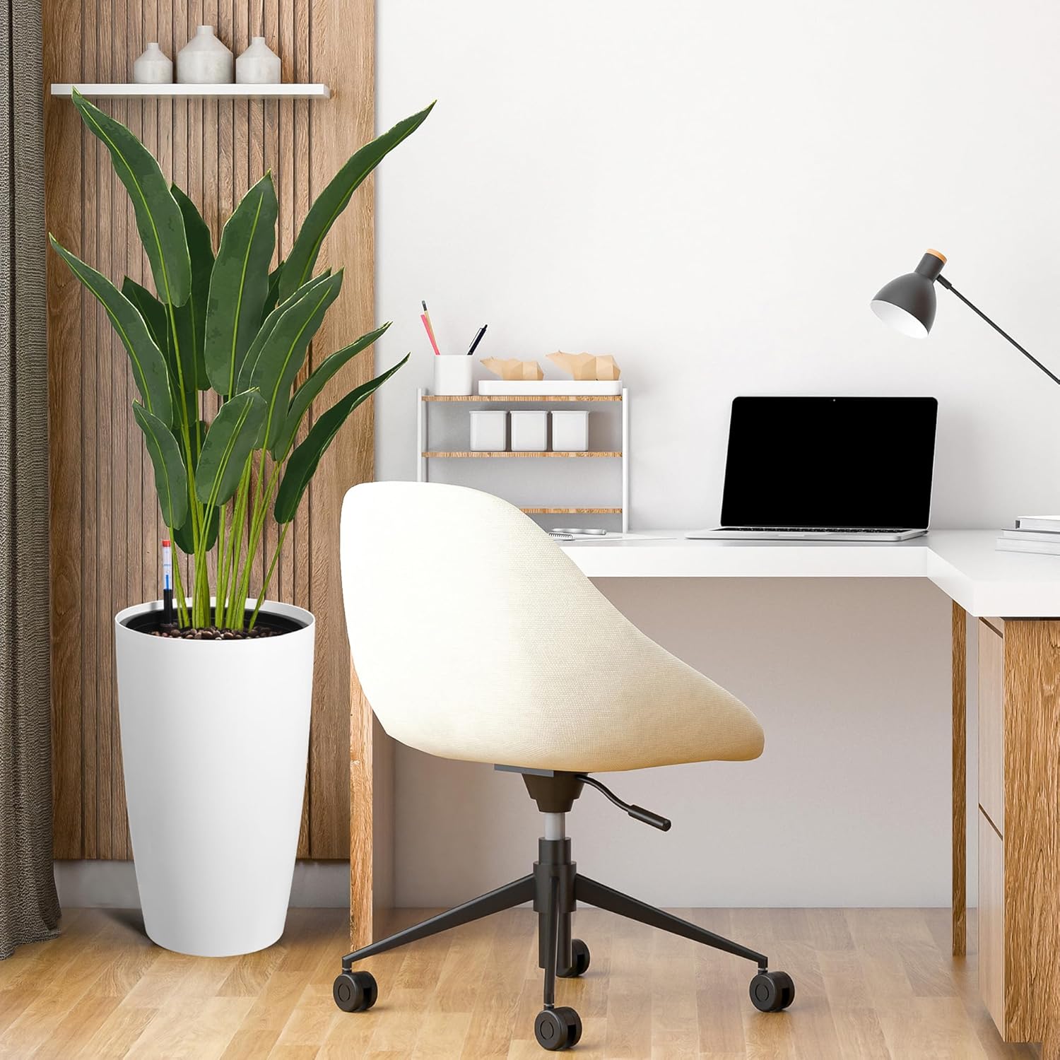 22" Tall Round Planter Set of 2, Self Watering Pots for Indoor Plants, Large Flower Pot Outdoor with Built-in Drainage and a Water Level Monitor, for Patio, Porch, Living Room, or Home Office, White