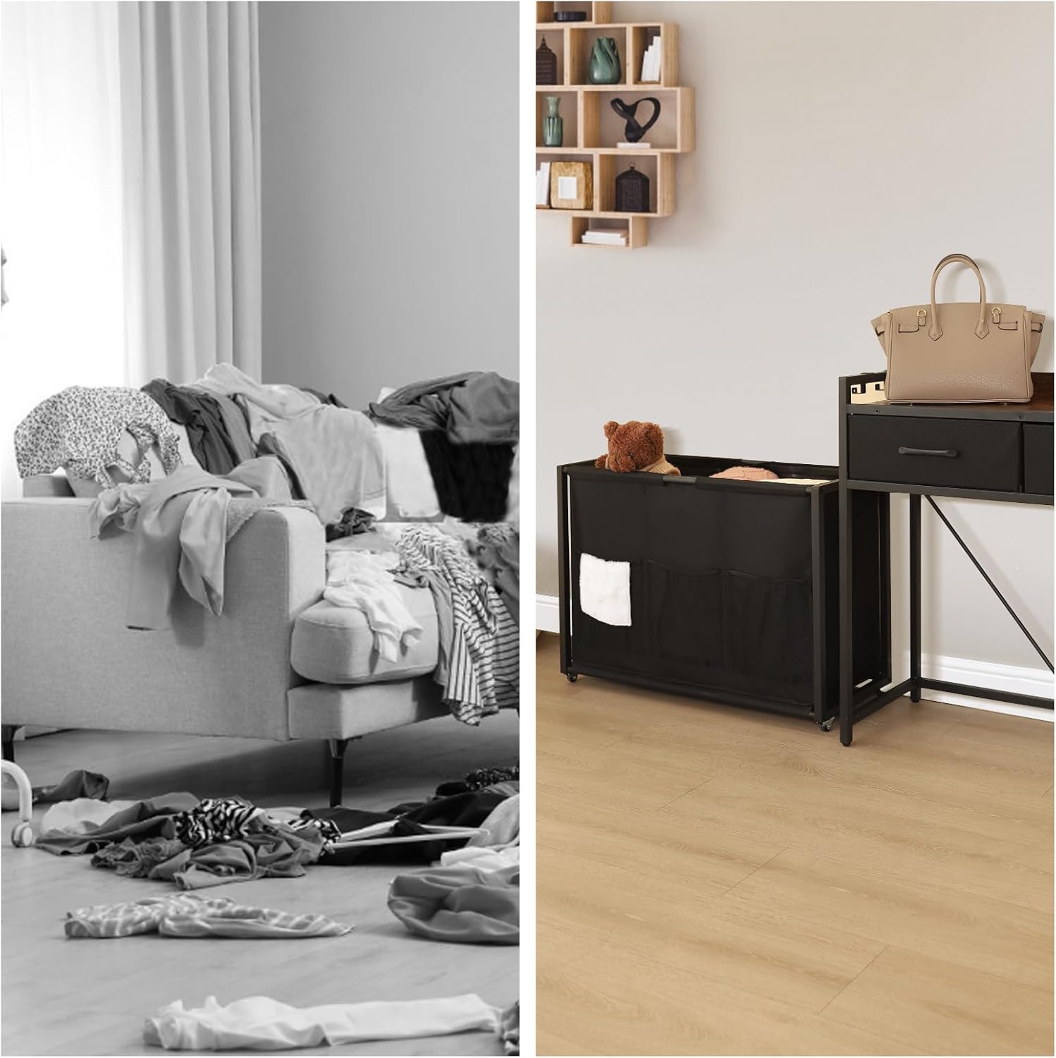 • Large Storage Capacity:Laundry basket with rolling wheels are made of metal and Oxford cloth, and its interior is divided into three parts, you can classify and store dirty clothes, colored clothes and clean clothes, which greatly saves your life trouble; And the bottom is added to the pad, can prevent the clothes from falling