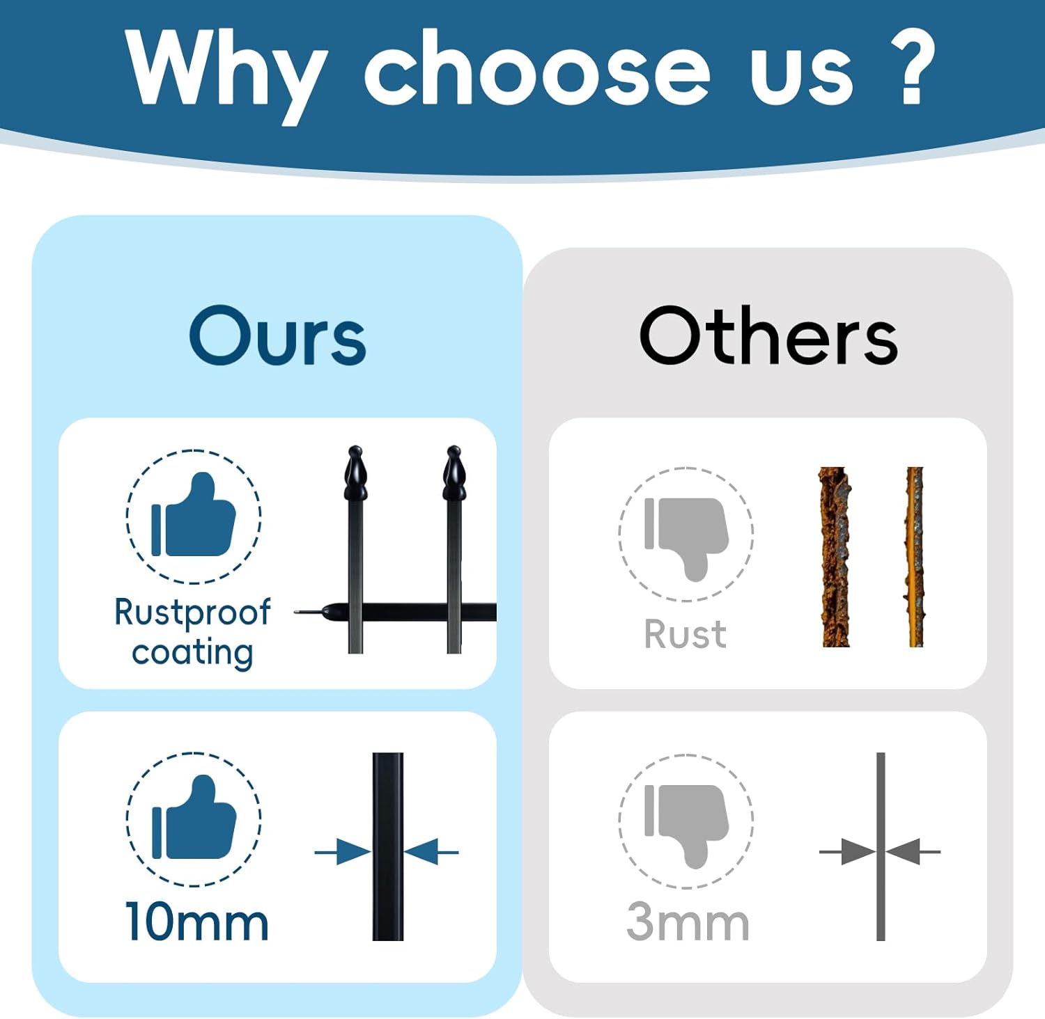 • 【Sturdy and Durable】This metal garden fence is made of 10mm diameter wrought iron welded together and covered with a black rust-resistant coating that won't rust easily. Compared to wood fences and plastic fences, it requires no frequent maintenance, is fearless of insect bites and corrosion, effectively withstands harsh weather, and is durable.