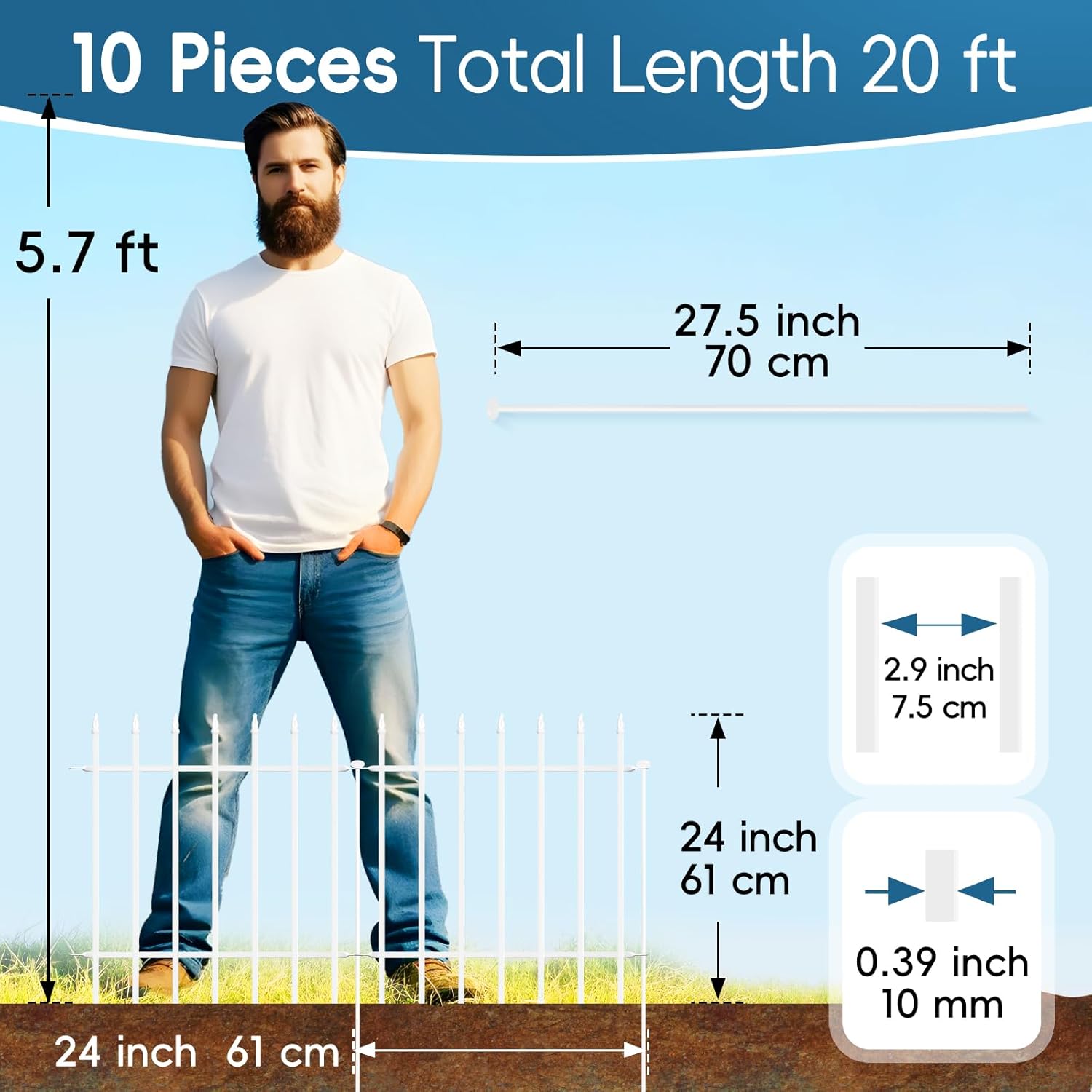 • 【Sturdy and Durable】This metal garden fence is made of 10mm diameter wrought iron welded together and covered with a white rust-resistant coating that won't rust easily. Compared to wood fences and plastic fences, it requires no frequent maintenance, is fearless of insect bites and corrosion, effectively withstands harsh weather, and is durable.