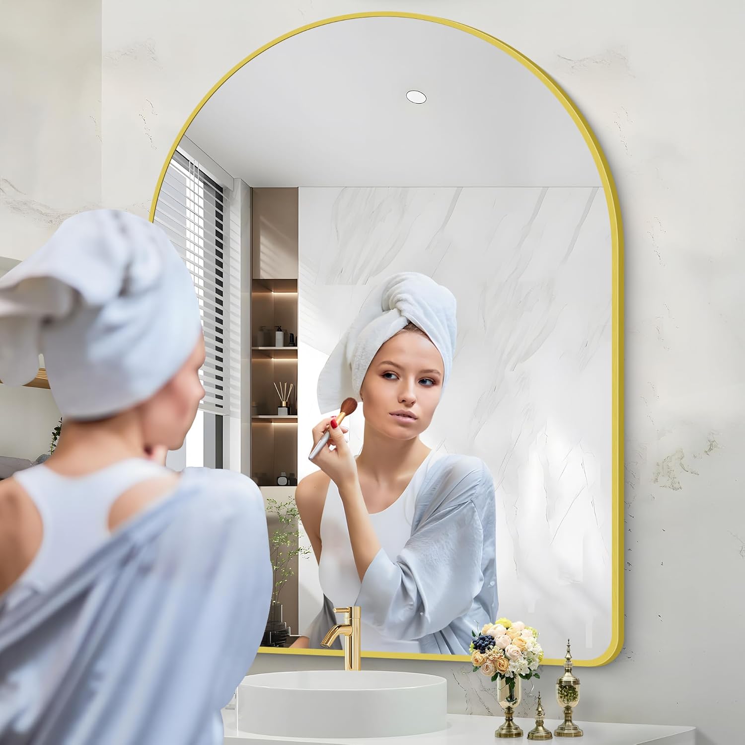 • Arched Bathroom Mirror Design: The Arched-top wall mirror makes your bathroom more elegant and classy, which especially attracts your eyes.bathroom mirrors for over sink,living room wall decor, gold arched mirror Ideal for wall mirrors decorative, gold mirror for bathroom make the space more brighter and spacious.
