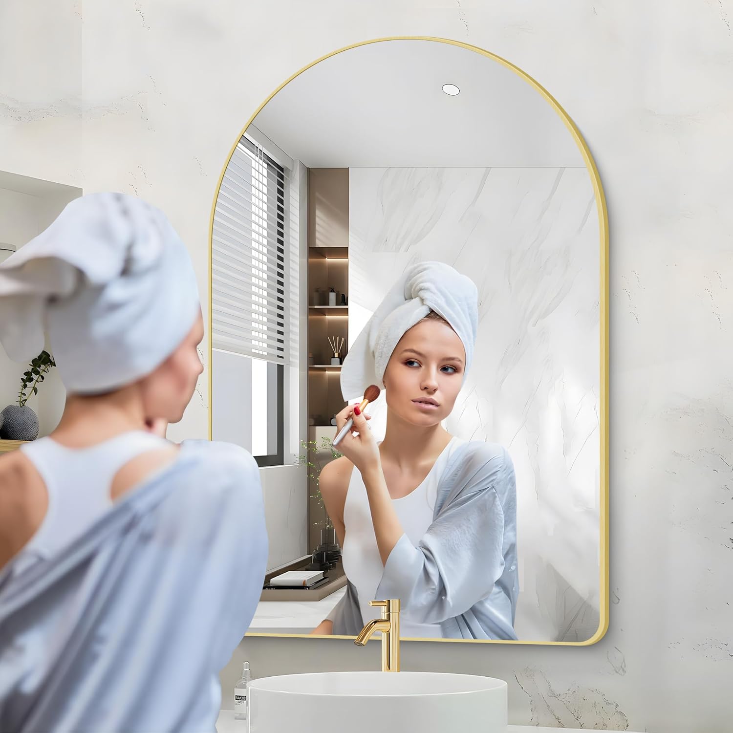 • Arched Bathroom Mirror Design: The Arched-top wall mirror makes your bathroom more elegant and classy, which especially attracts your eyes.bathroom mirrors for over sink,living room wall decor, gold arched mirror Ideal for wall mirrors decorative, gold mirror for bathroom make the space more brighter and spacious.