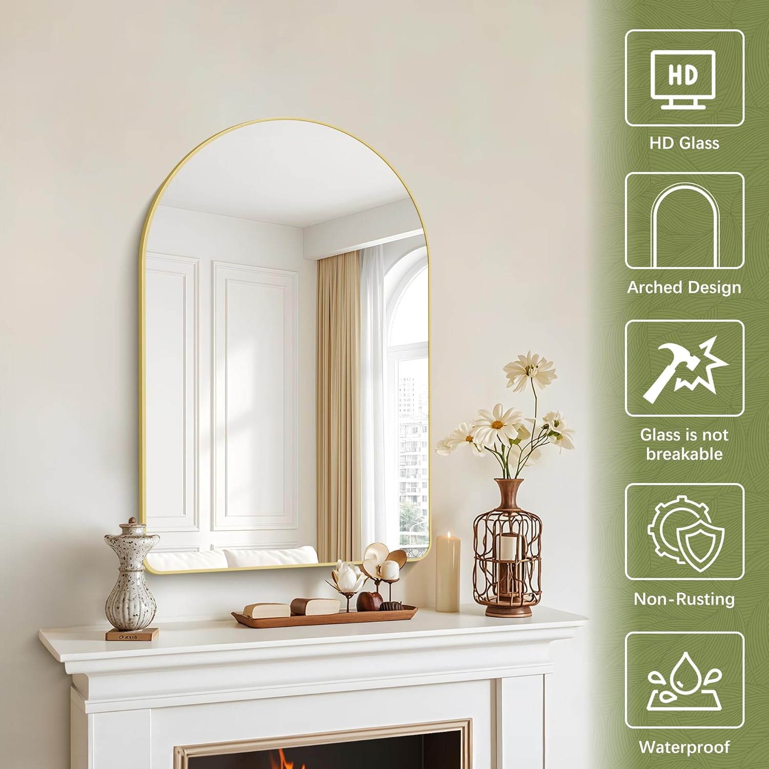 • HD Explosion-proof Glass: GLASHOM arch mirrors for wall is made of premium explosion-proof membrane glass so that it's safer for you and your family.Aluminum alloy frame which is anti-rust, and also the metal-framed mirror is with explosion-proof membrane built-in which ensure the mirror being safely and securely for using. The wall-mounted mirror for the bathroom performs beautifully in every climate.
