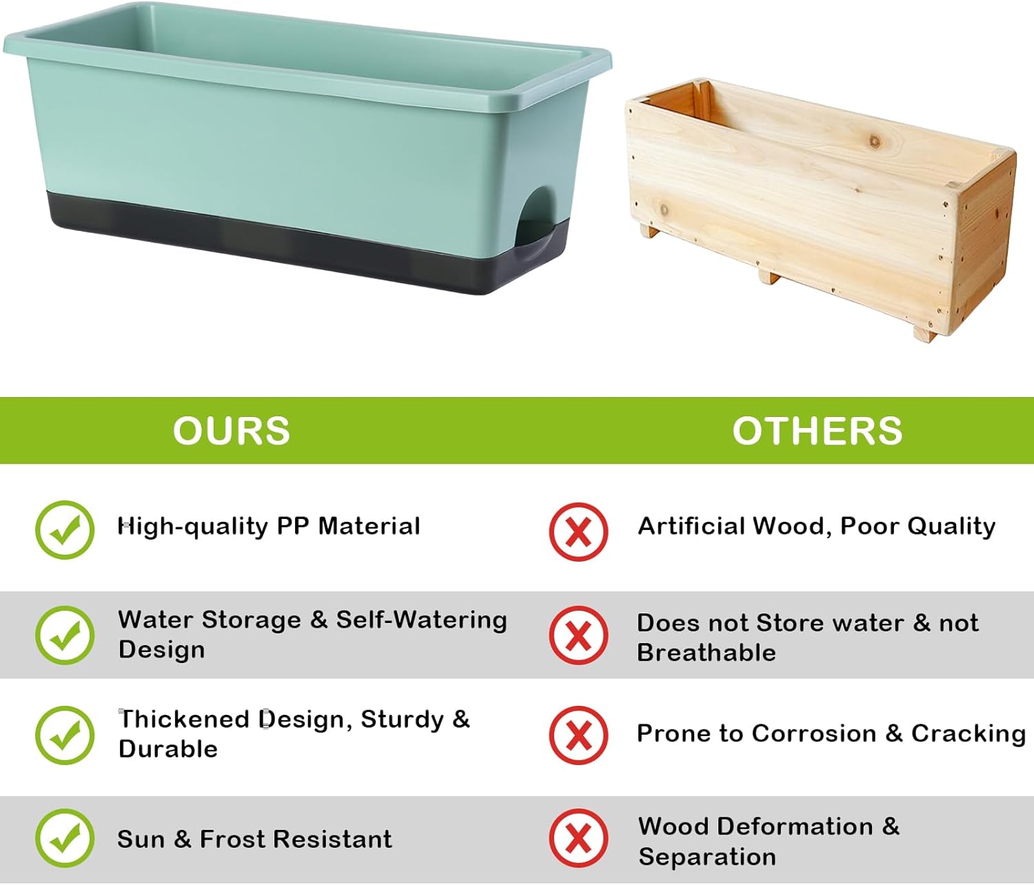 • 【Premium & Durable】The planter pots are made of high quality PP material and has been thickened to bear up to 300KG (660LB). This window box planter is sturdy, wear-resistant and durable. It can be exposed to light, wind, and sunlight for long periods of time, with a lifespan of decades. It is an excellent planter box for both indoor and outdoor.