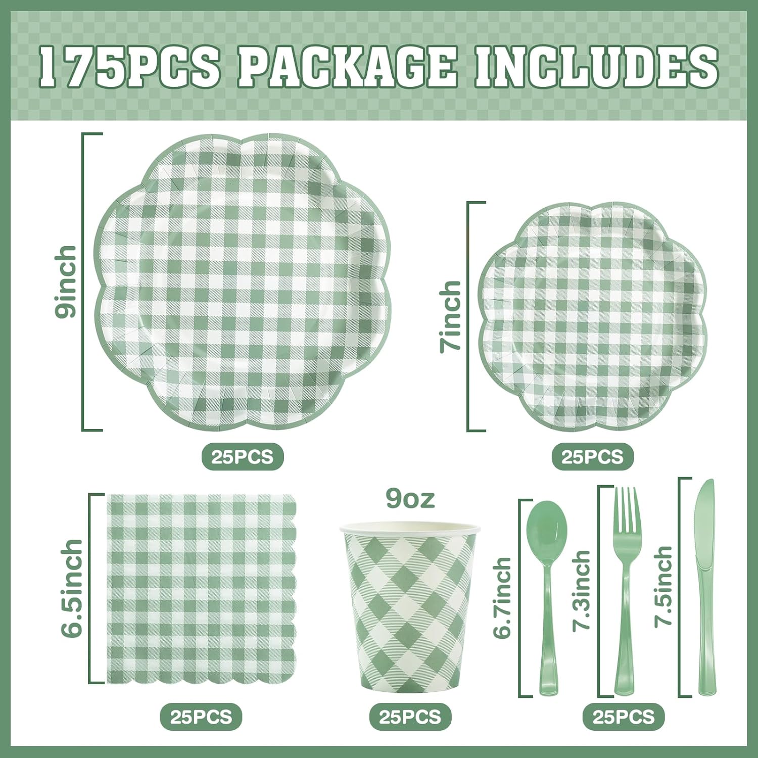 175 Pcs Sage Green Gingham Paper Plates and Napkins Party Supplies - Sage Green and White Checkered Plates Scalloped Plaid Plate for Birthday Dinner Picnic BBQ Party Decorations, Serve 25 Guests