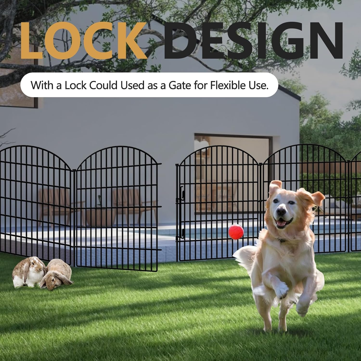 • MORE AVAILABLE SIZE: The classic arch shape design garden fence single piece measures 26.77" wide, 33" high, 1.5" gap. Comes with 11 metal stakes are 44" in height, which can be inserted into about 12.6 inches above the ground, making it strong enough to prevent animals from entering & leaving, dog digging, and even keep rabbits away from your plants. A total of 10 fence panels with a lock, connecting 11 fence stakes, the total length of the garden fence is approximately 21.92 ft.