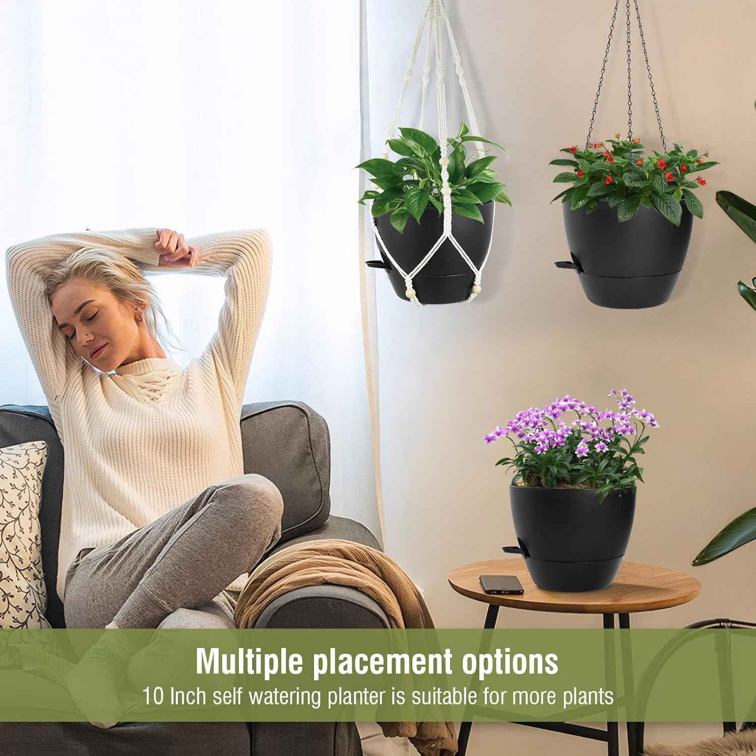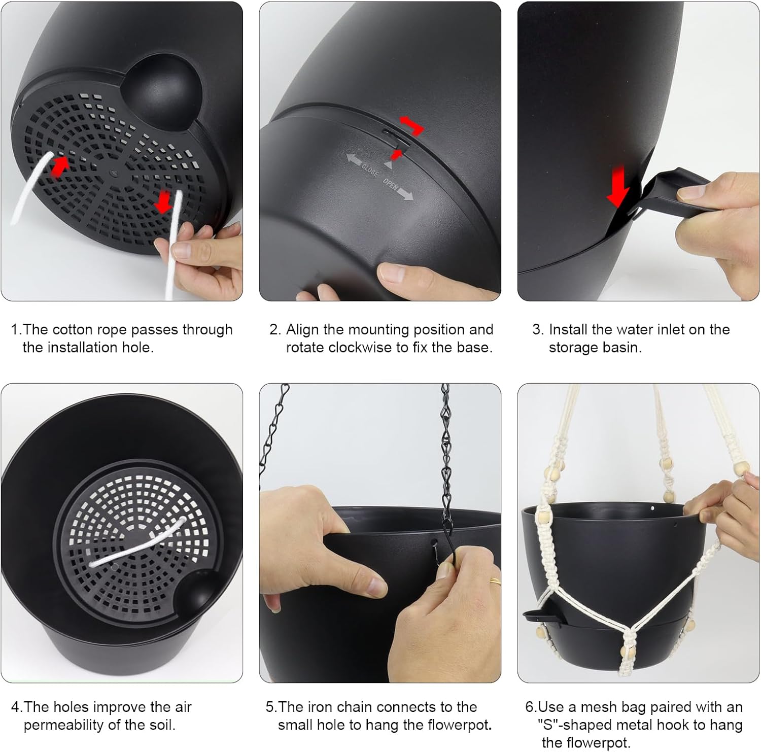 • 【Self-Watering Hanging Planter with Removable Tray】This hanging flower pot comes with a detachable bottom tray that acts as a water reservoir, holding a good amount of water. When your plant needs water, it’s absorbed through cotton wicks from the reservoir to the soil, reducing how often you need to water