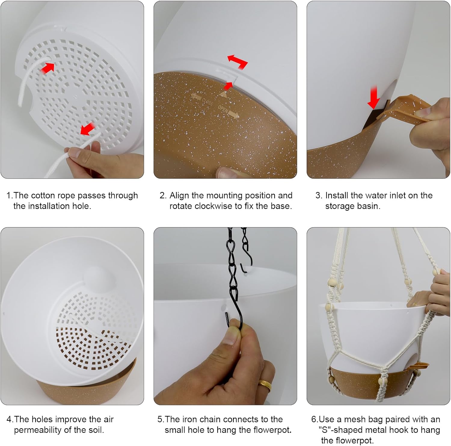 • 【Self-Watering Hanging Planter with Removable Tray】This hanging flower pot comes with a detachable bottom tray that acts as a water reservoir, holding a good amount of water. When your plant needs water, it’s absorbed through cotton wicks from the reservoir to the soil, reducing how often you need to water