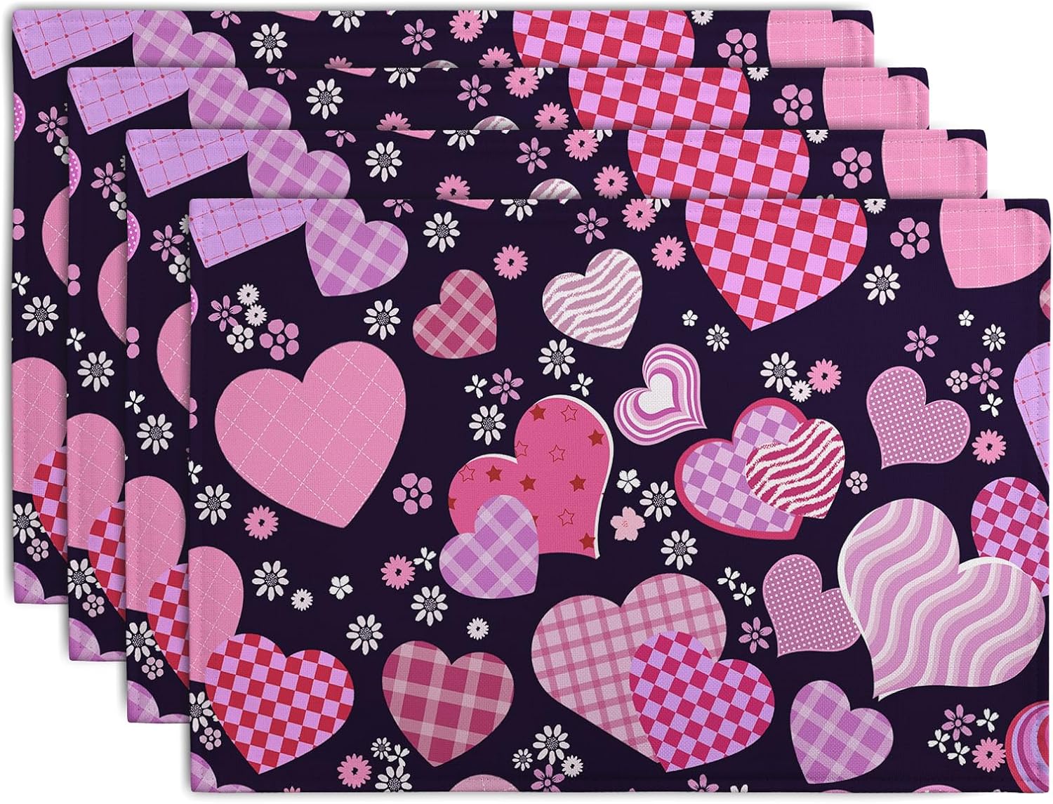 Pink Love Hearts Valentine's Day Placemats Set of 4 Seasonal Valentines Anniversary Wedding Linen Table Mats Pink Black Washable Place Mats for Party Kitchen Dining Outdoor Indoor Decor 12x18 Inch