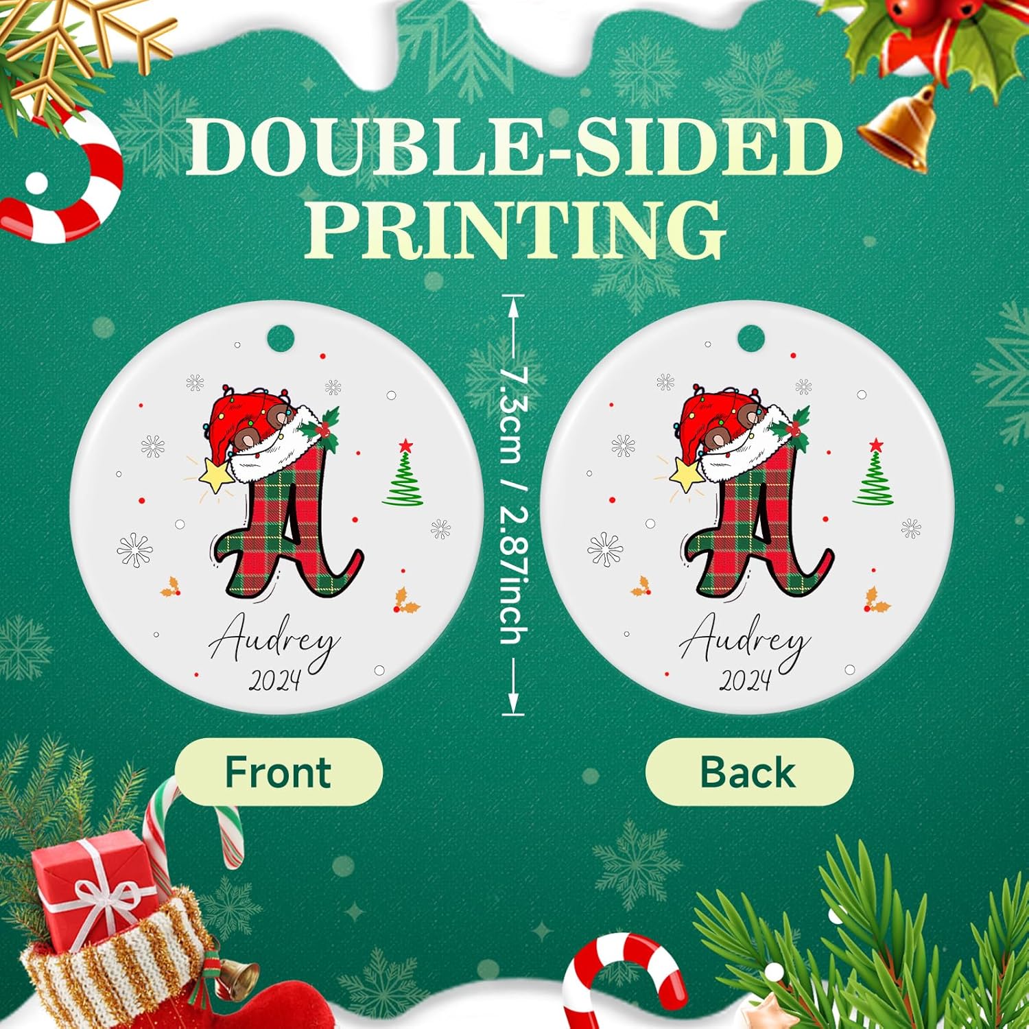 • 【Double-Sided HD Printing Christmas Ornament Personalized】Custom Christmas ornament for Christmas tree use HD printing technology, double-sided printing the same, bright colors,not easy to fade.About 2.87", you can type the family member name,we will print the name on the custom ornament, give personalized family ornament to him or her as Christmas gift ideas