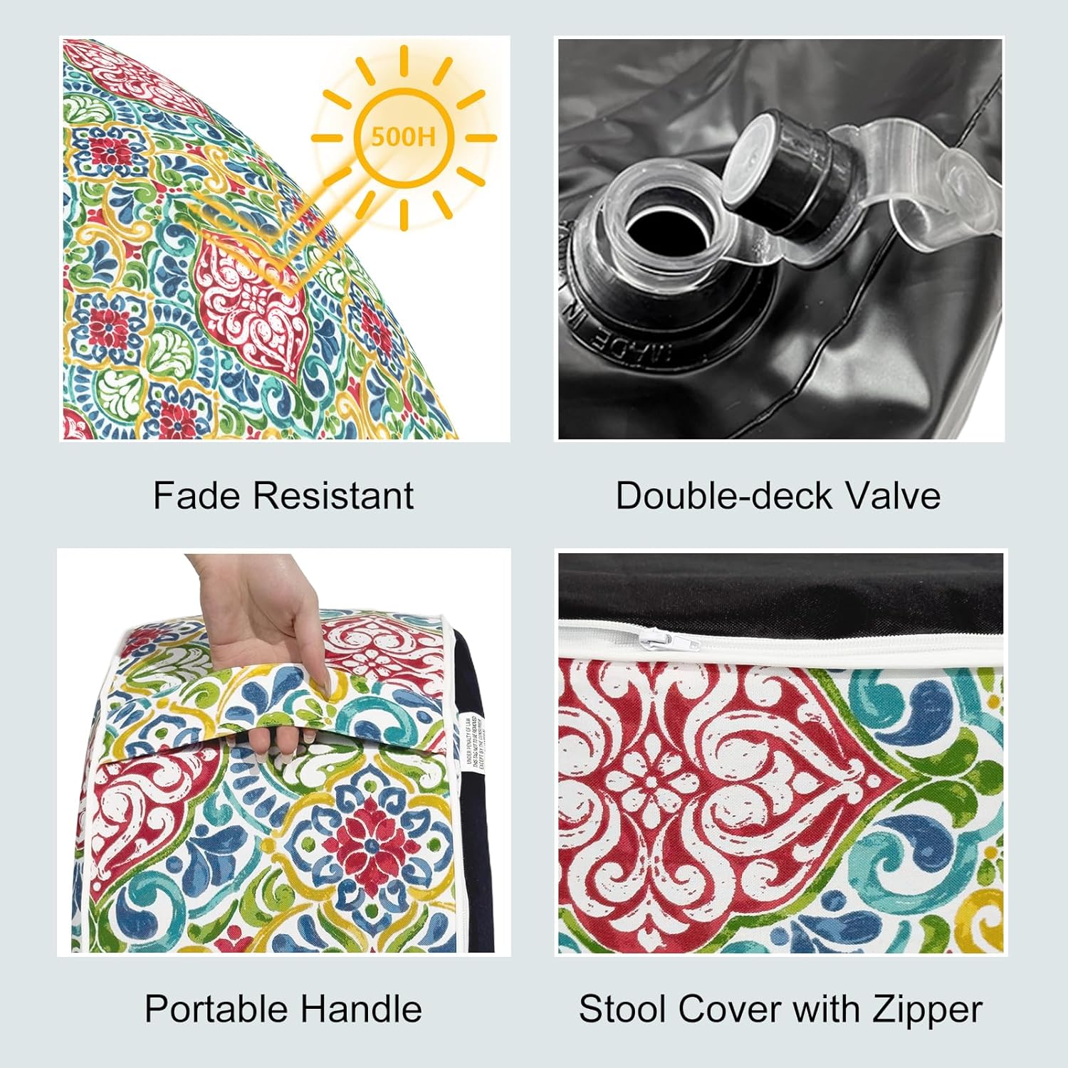 • Package Including: 1 pc inflatable large round ottoman measures D31" x W31" x H14". Great as a footstool or seat. Fashion printed cover and sturdy PVC liner