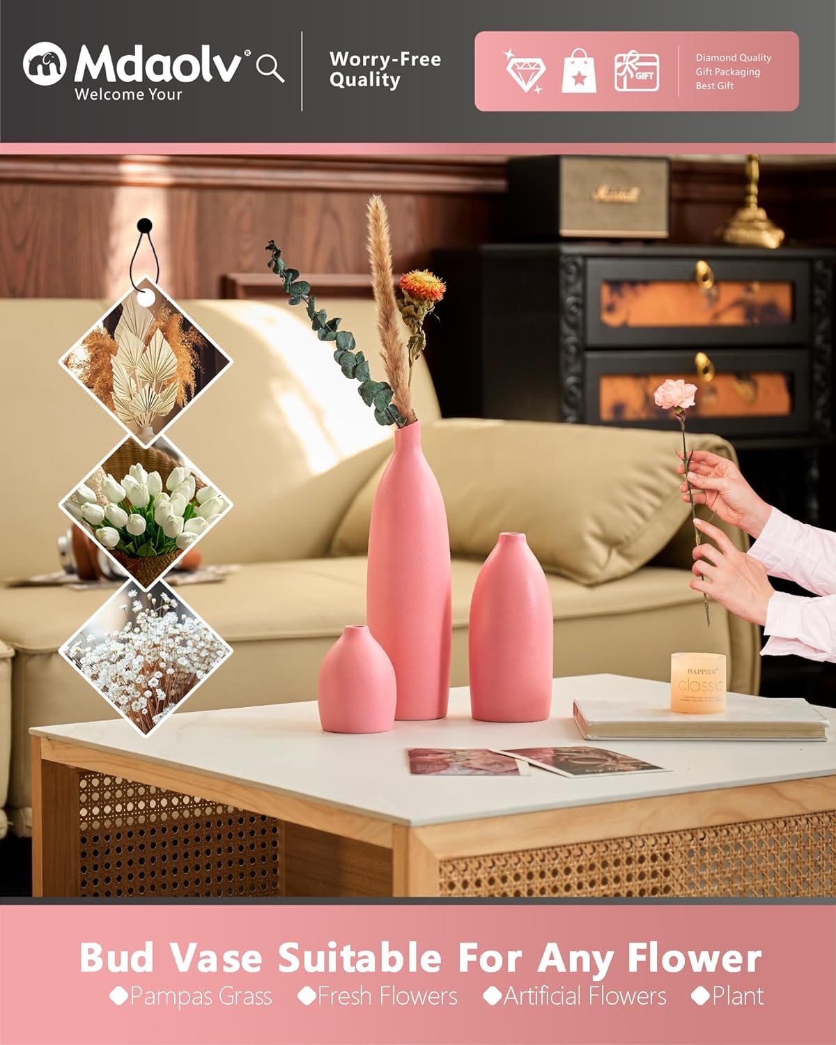 • Simple Modern Boho Pink VasesHome Decor - Our modern and simple vase set has an elegant pink style and a simple modern look that can blend perfectly with any decor style, bringing elegance and romance to your home. Decorate your living room, kitchen, bedroom, bathroom or office with these small pink ceramic vases. These modern bohemian pink vases are perfect centerpiece table decorations. They will also look great on your shelves, mantels, entry tables, etc.