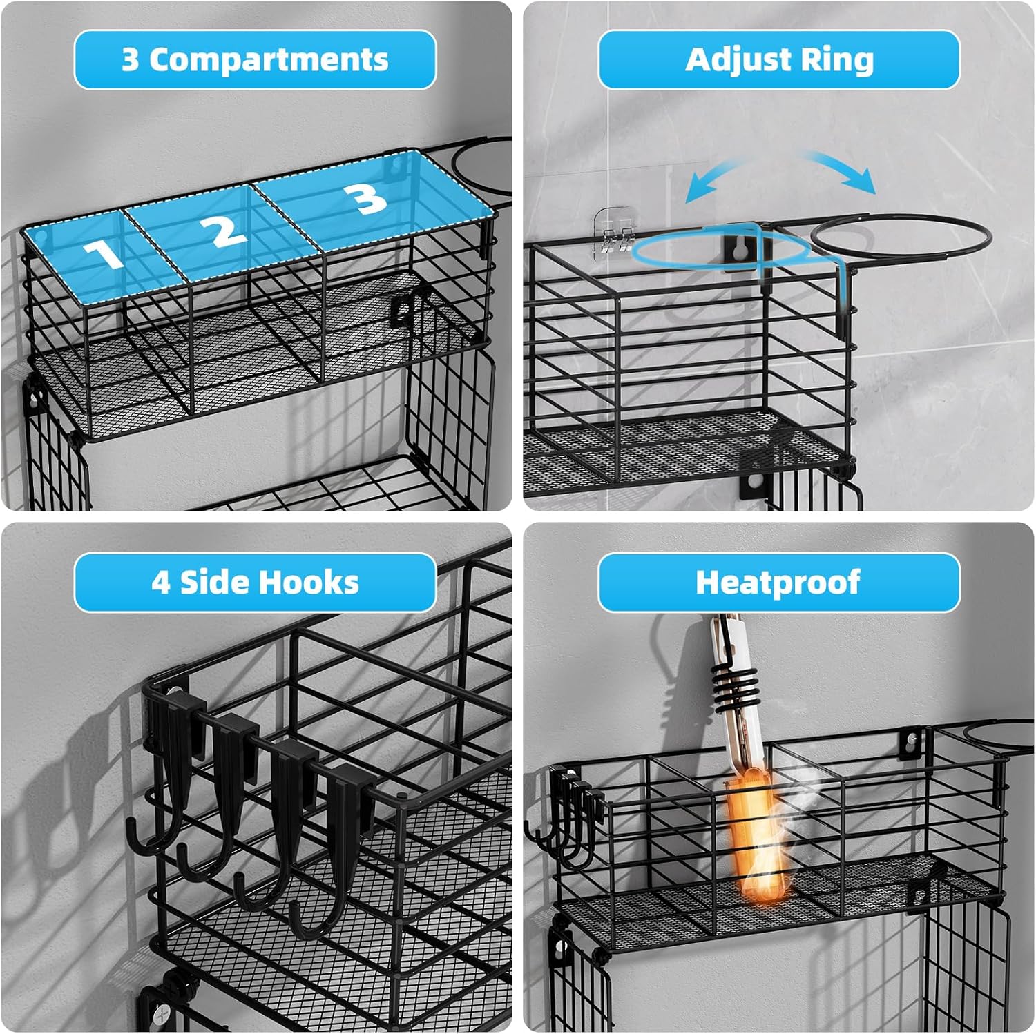 • 【Heat-Resistant Material】The wall-mounted hair tool organizer is made of high-quality metal, it withstands high temperatures, making it durable and safe for storing hot styling tools like straighteners and curling irons without deformation or rusting.