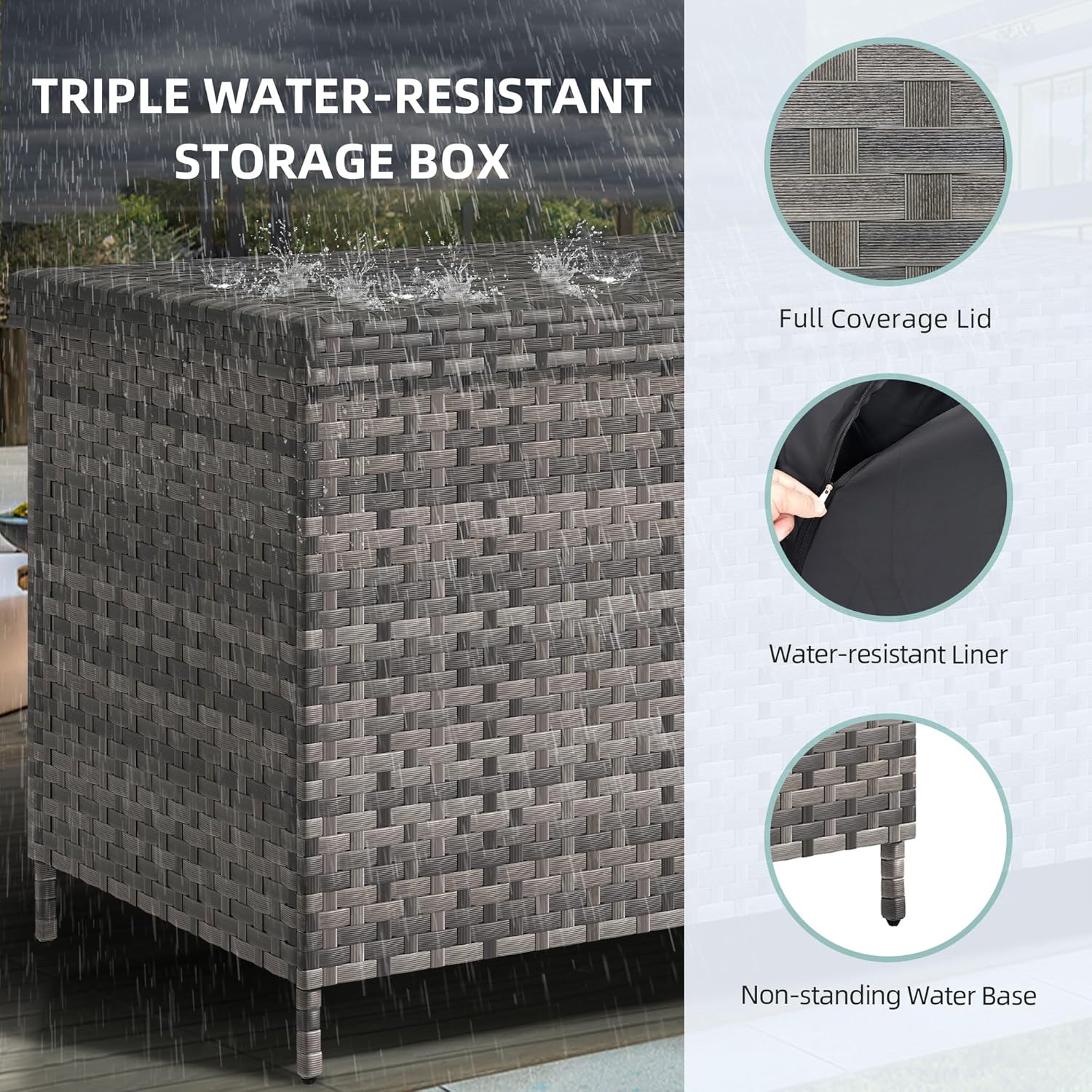 • Ultra Water Protection: This robust wicker deck box includes a zippered polyester bag and elevated legs, keeping belongings dry and secure from rain and water seepage. Ideal for outdoor storage.