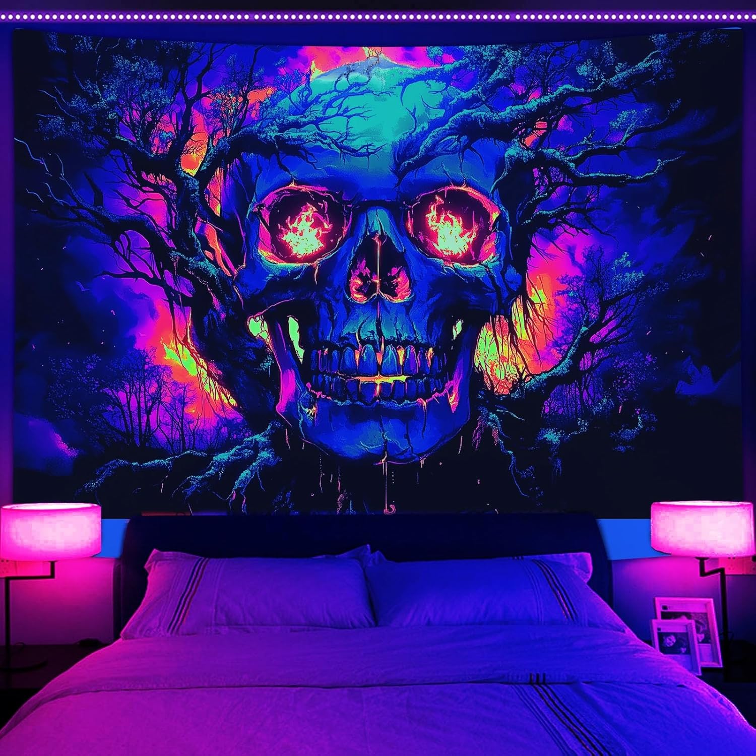• Unique Pattern Design:The blacklight skull tapestry features a mysterious skull, charming mushrooms, and psychedelic flowers and plants. Under black/ultraviolet light, it can fill your room with mysterious and psychedelic colors.