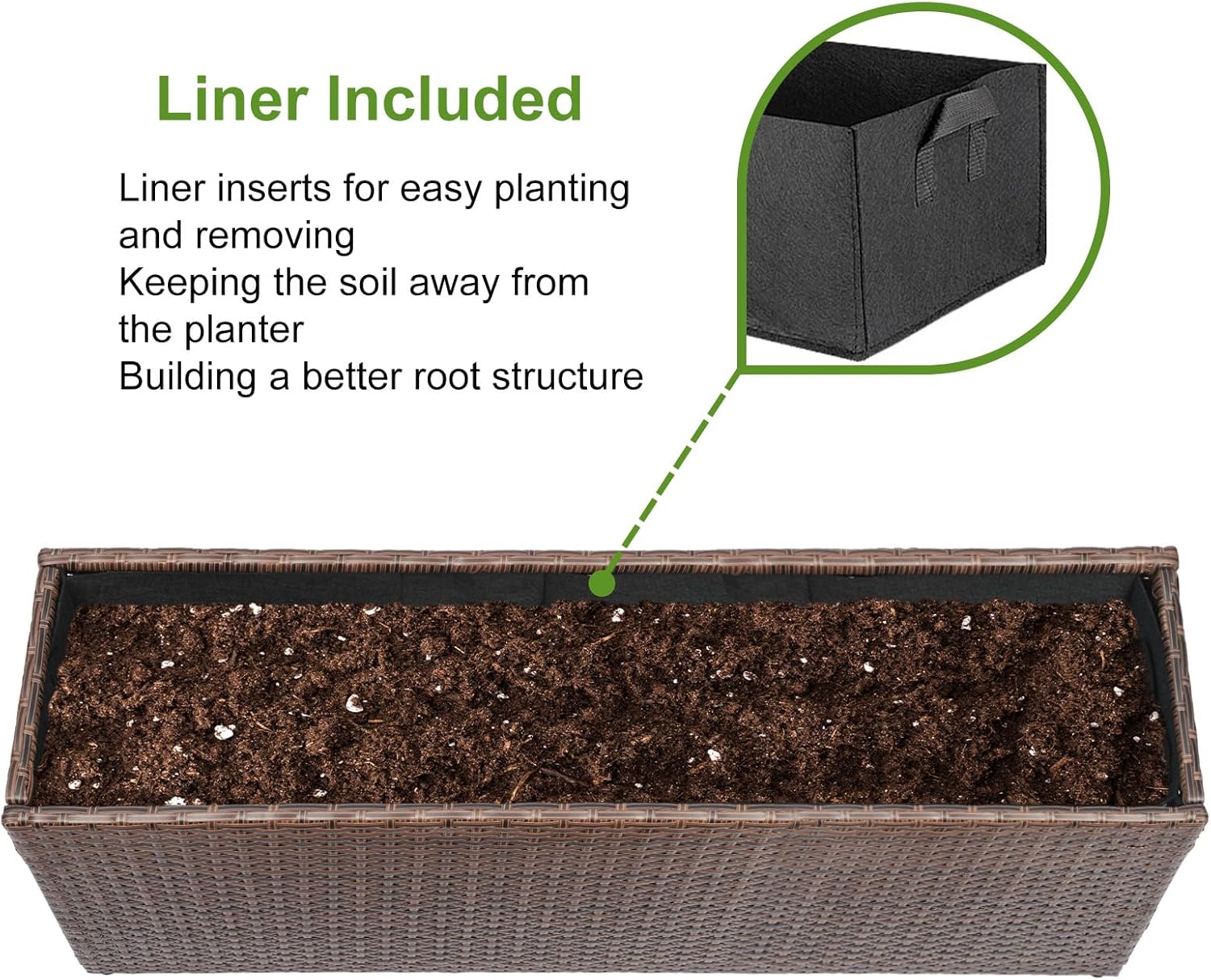 • Removable Liner: Each wicker planter comes with a nonwoven fabric liner (measures 35 x 10 x 10 inch) that separates wicker from the soil. Keep planter in excellent condition to prevent weeds and other invasive species from interfering with plant growth