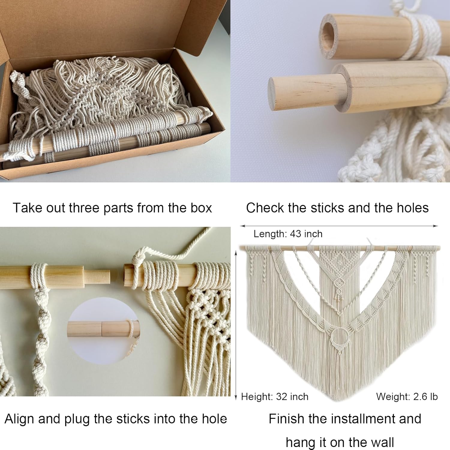 • Easy to Install: The package comes with 3 separate parts of short macrame wall hangings which could be easily connected together with the screws inserted in the wood rod.