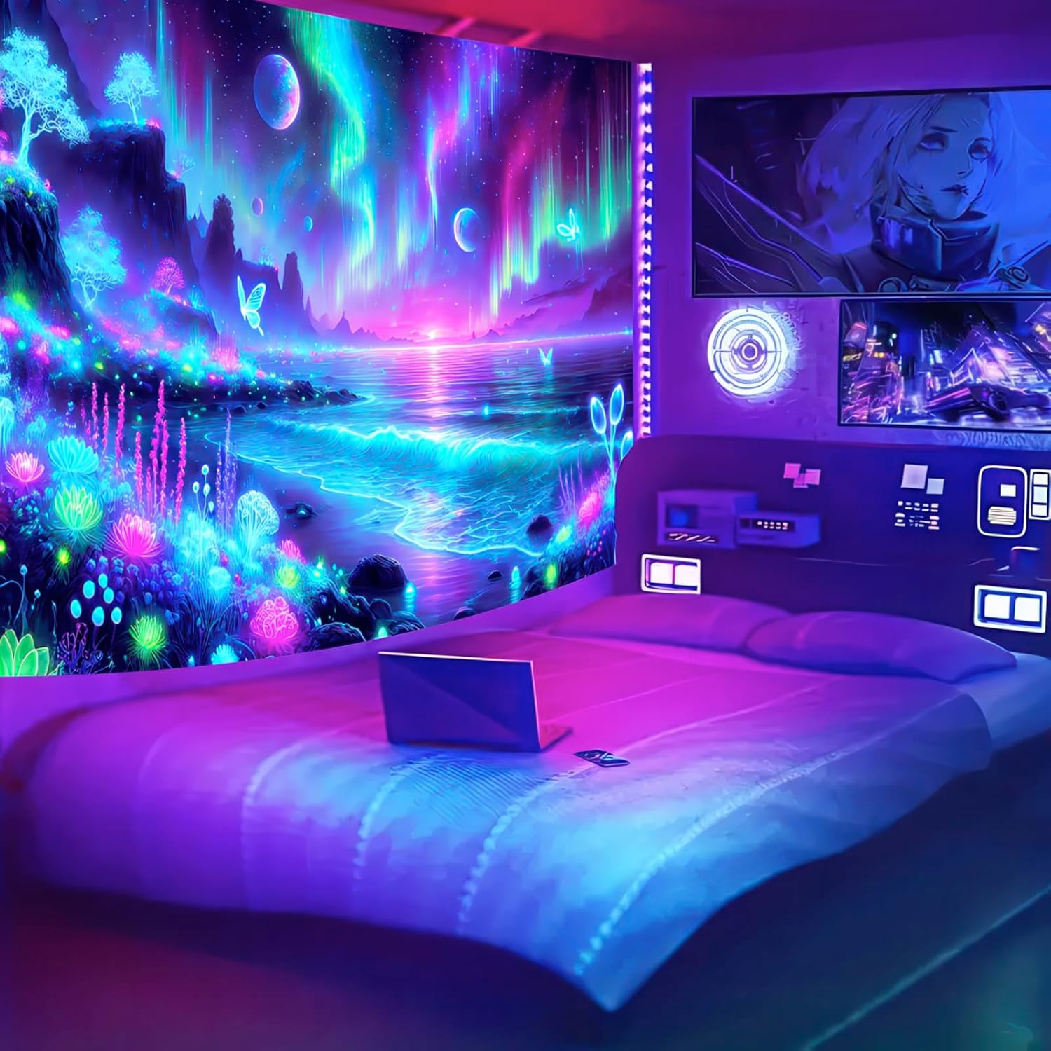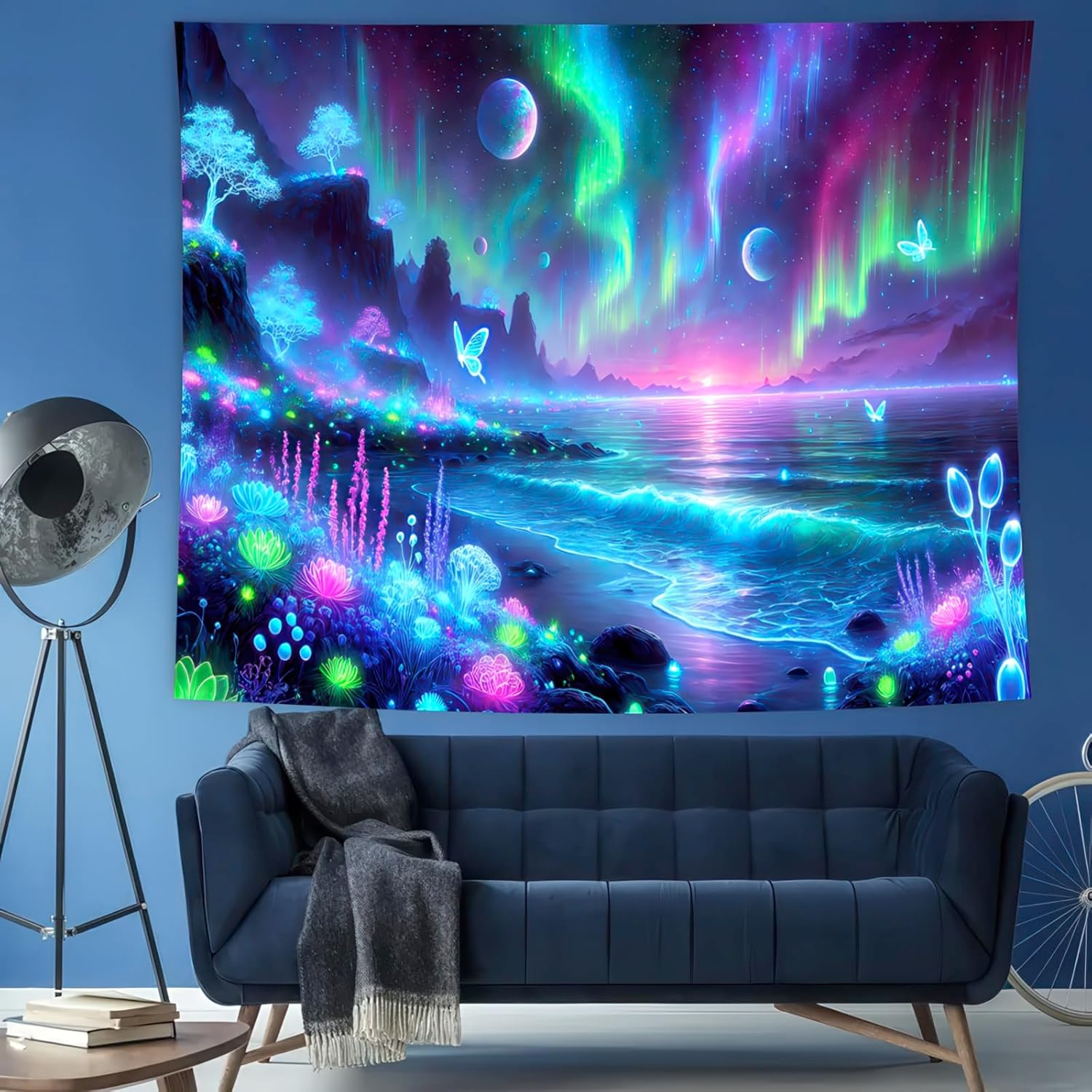 • UV/Blacklight Reactive: This Fantasy Forest Tapestry features intricate patterns of butterflies, mushrooms, the Milky Way, the moon, and stars. Under normal lighting, it is already a beautiful, vibrant piece. When exposed to blacklight or UV light, the butterflies and plants come to life, glowing brightly and creating a mesmerizing, magical effect in the dark.