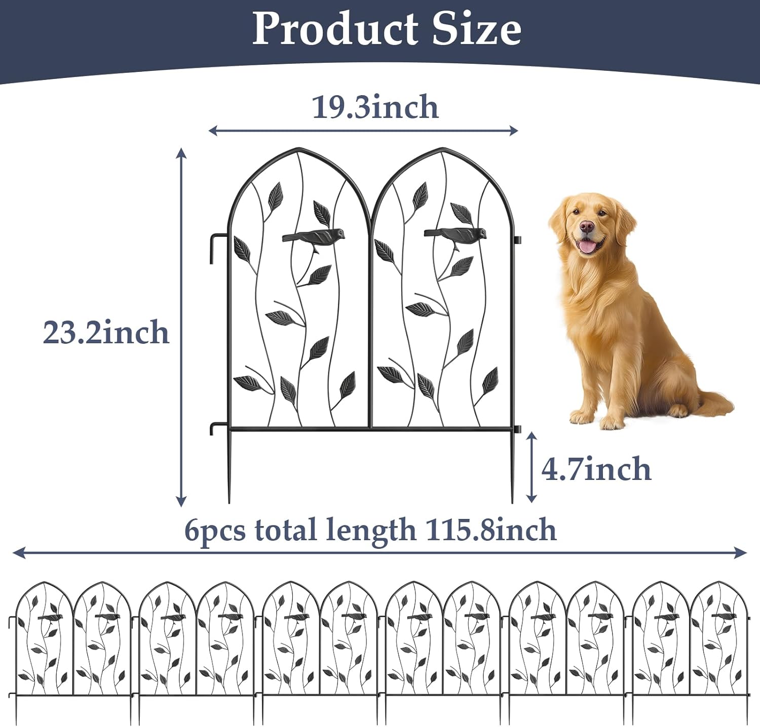 • Vintage Retro Style: : Single piece measures 23" high x 19" wide, pack of 6 panels, It's 10 ft long to connect all of them. This wrought iron fence is made of high quality metal material, sturdy for years of outdoor use.