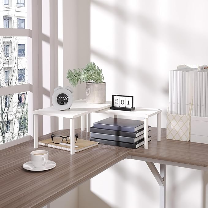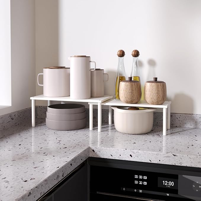 • 【Flexible Combination, Space Optimization】With their unique design, with one slightly smaller than the other, these shelf organizers can be stacked on top of one another, nested, used separately, or even in an L-shape.It is a flexible storage solution that transforms your kitchen into a more organised and tidy space.