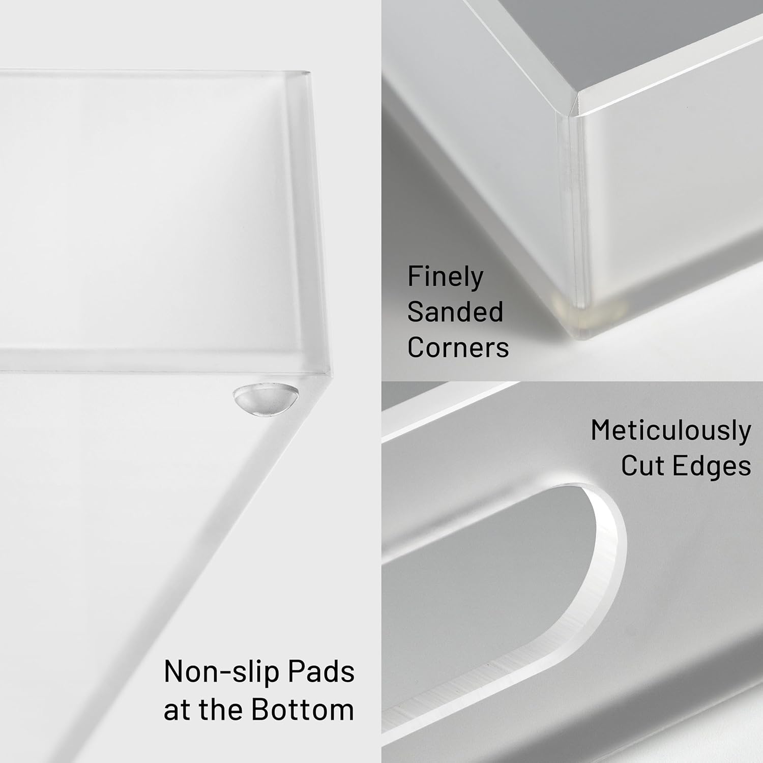 • SECURE & STABLE: Our acrylic tray is designed with silicone anti-slip pads to protect surfaces from scratches and provide stability. With these pads in place, the tray remains steady on various countertops, preventing any sliding or movement.