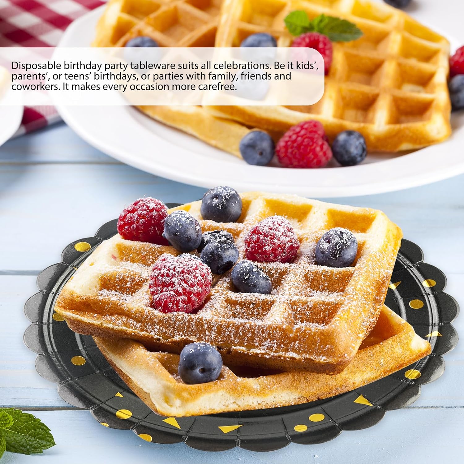 50PCS Birthday Paper Plates - 7 Inch Birthday Cake Plates Scalloped Black and Gold Dessert Plate Disposable Tableware Decorations for Birthday's Party Supplies