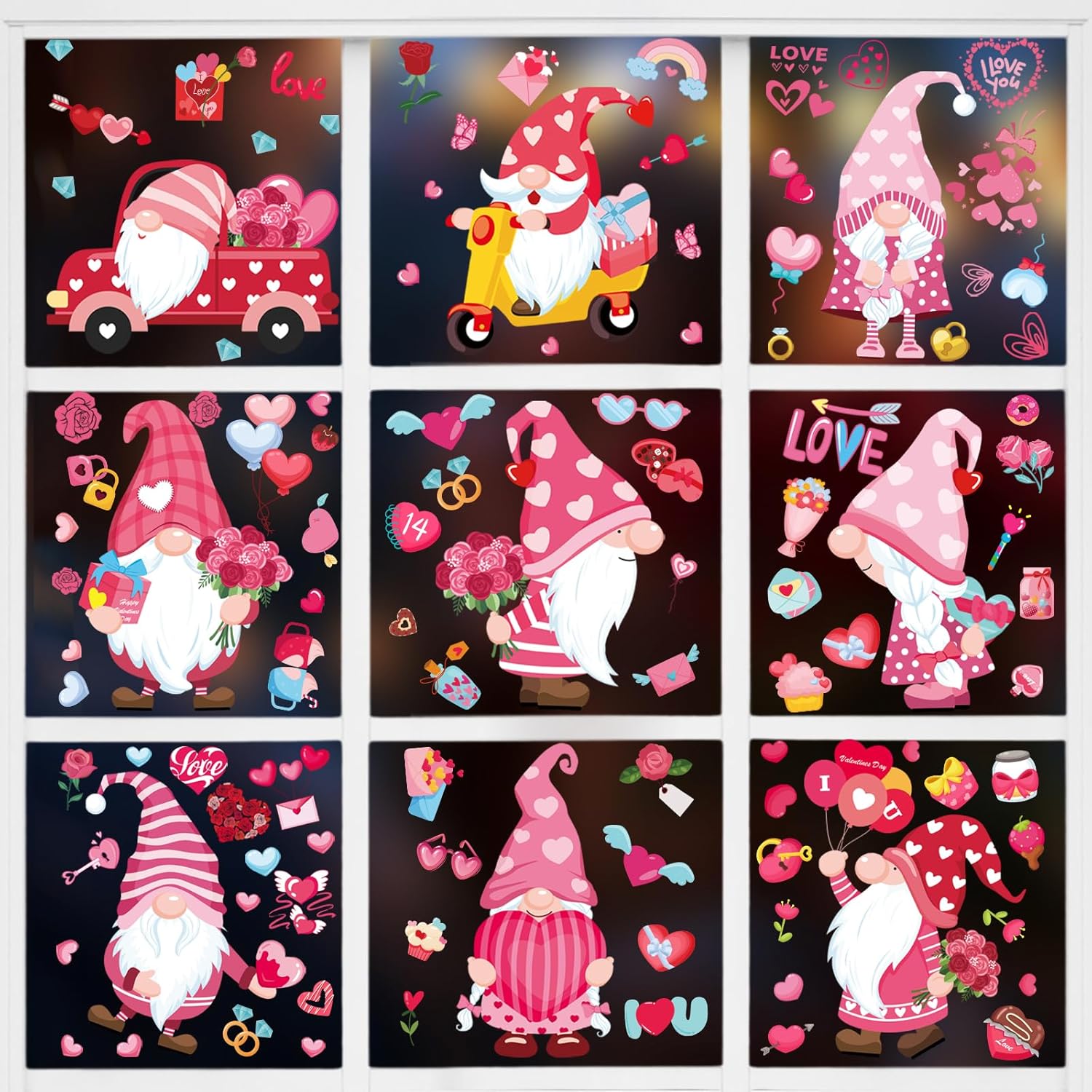 DC-BEAUTIFUL 107 PCS Valentines Window Clings, 9 Sheets Double-Sided Pink Love Heart Gnome Valentine Decoration Window Stickers, Reusable Static Holiday Window Decals for Home Wedding Party Decors
