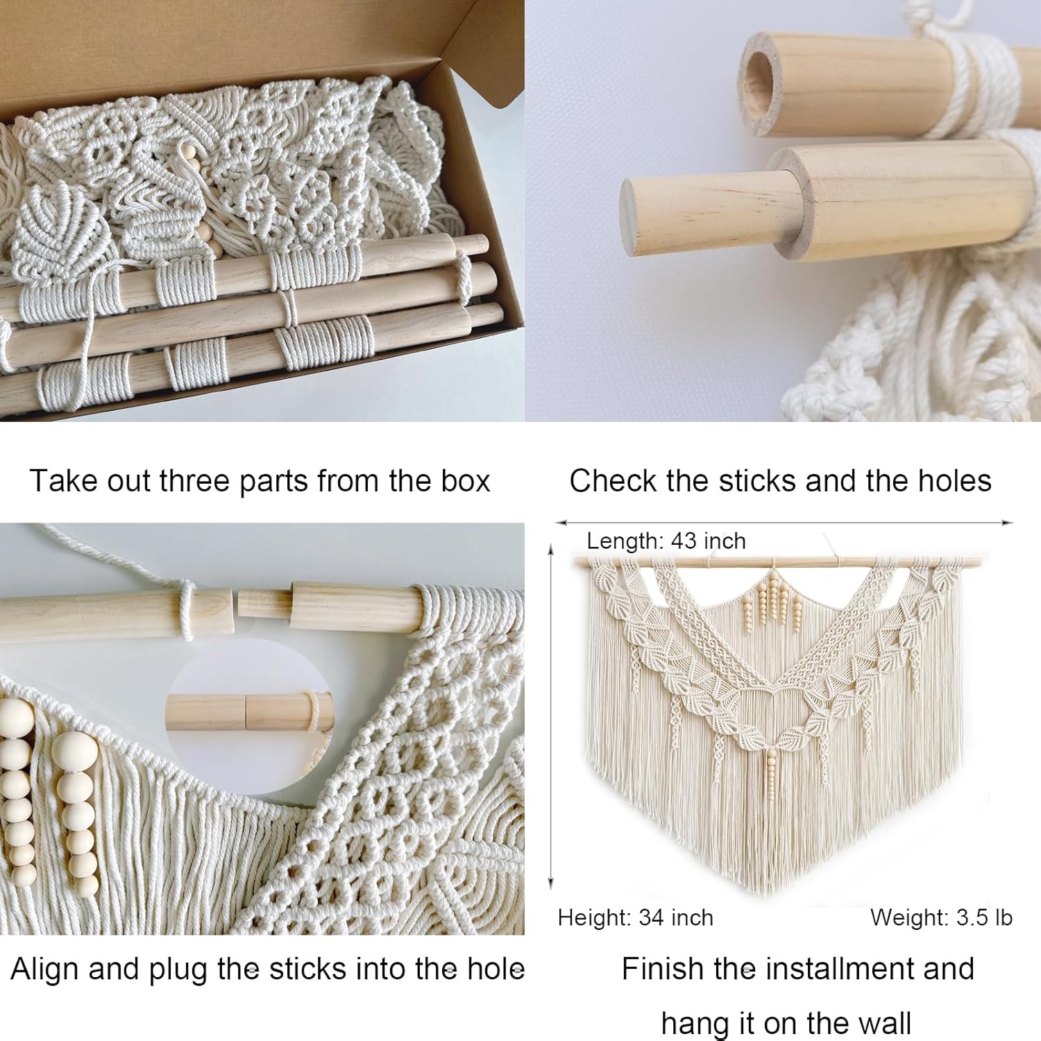 • Easy to Install: The package comes with 3 separate parts of short macrame wall hangings which could be easily connected together with the screws inserted in the wood rod.