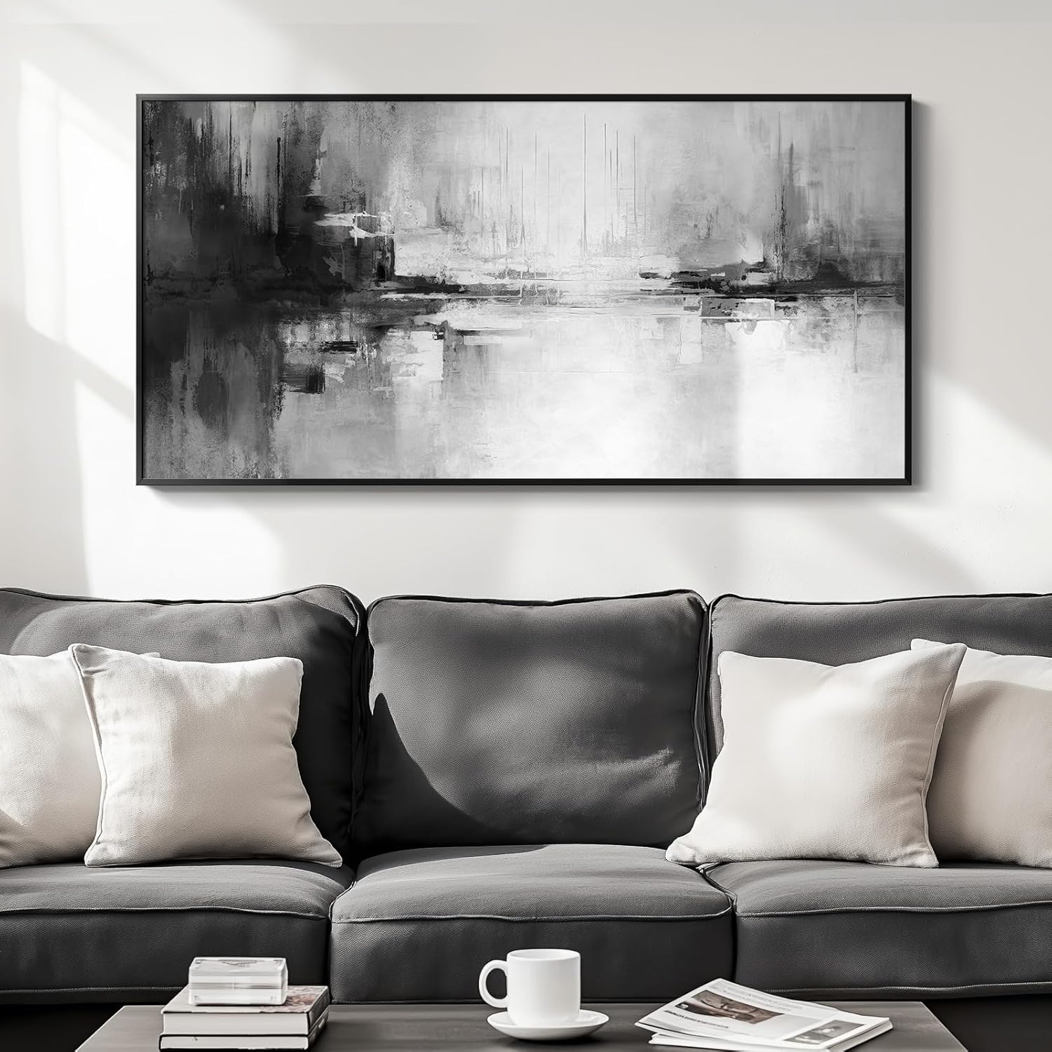 • [Framed Wall Art]: One piece modern minimalist black white abstract horizontal wall art prints, big size 28.5" H x 57" W, with a sturdy, rust-resistant, simple and stylish black frame, that blends seamlessly with a wide range of decor styles