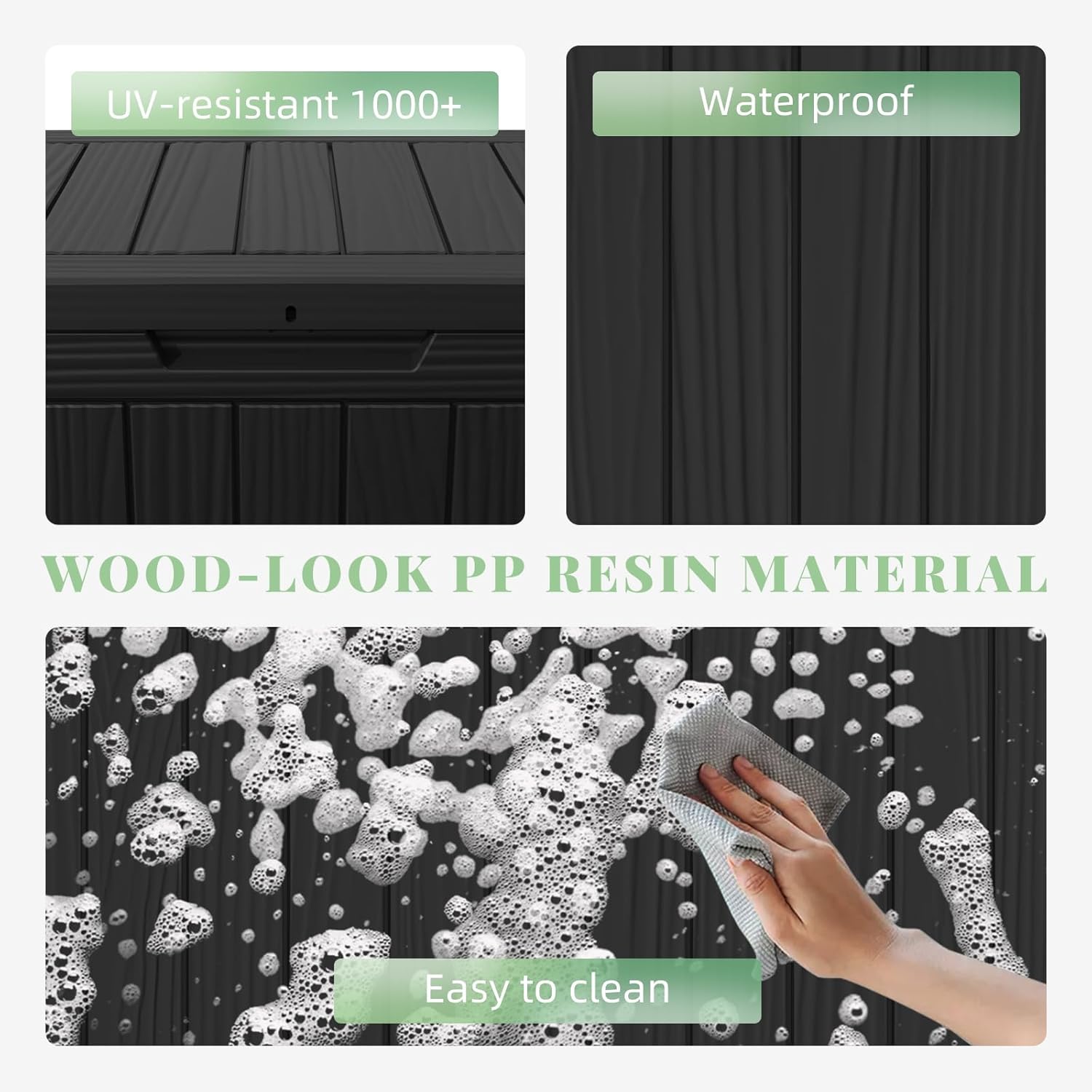 • 𝐃𝐮𝐫𝐚𝐛𝐥𝐞 𝐌𝐚𝐭𝐞𝐫𝐢𝐚𝐥 - Made from high-quality resin material, this deck box provides unyielding protection for your belongings. With up to 1000 SGS UV protection, your outdoor storage box will never warp, fade, or crack. It withstands harsh weather, intense sunlight, and cold climates. Whether it's the sun-drenched summer or the stormy winter, your items will be safely stored, remaining in pristine condition.