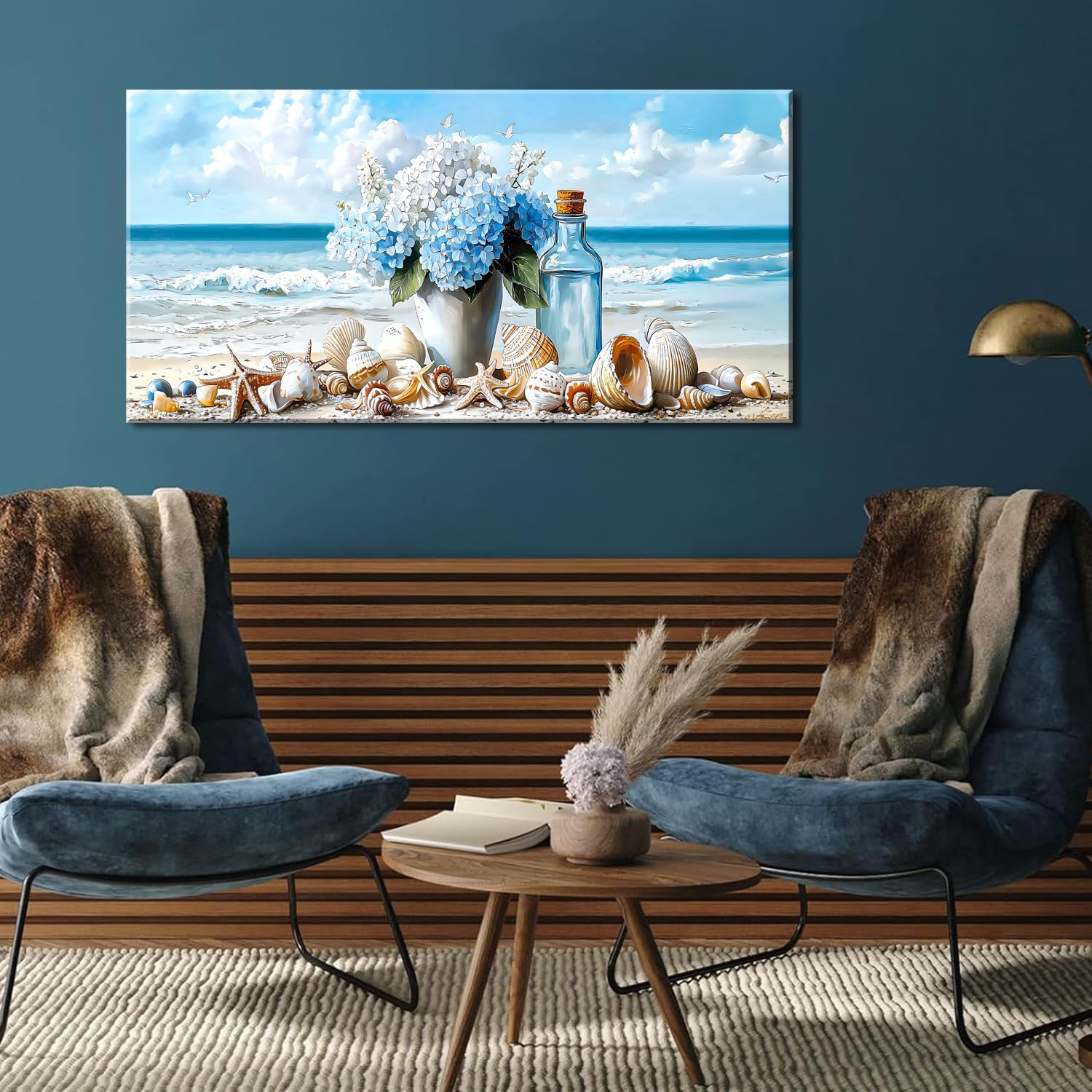 LASMOND Romantic Beach Wall Art for Living Room Blue Shells Conch Vase Canvas Prints Modern Large Flower Bottle Bedroom Ocean Artwork Decor (30x16 Inches)