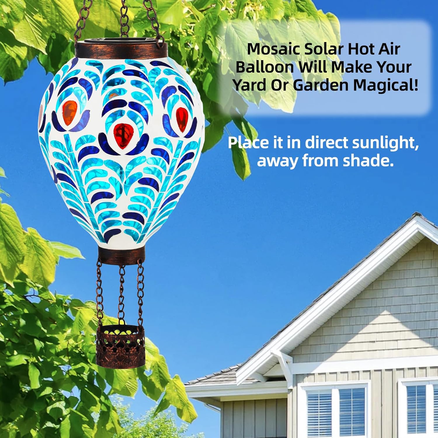 VOREEN Hot Air Balloon Solar Lantern, Mosaic Solar Outdoor Hanging Wind Light, Waterproof, Patio Festive Decor, Gift for Mom Wife Friend, Peacock Feather Design