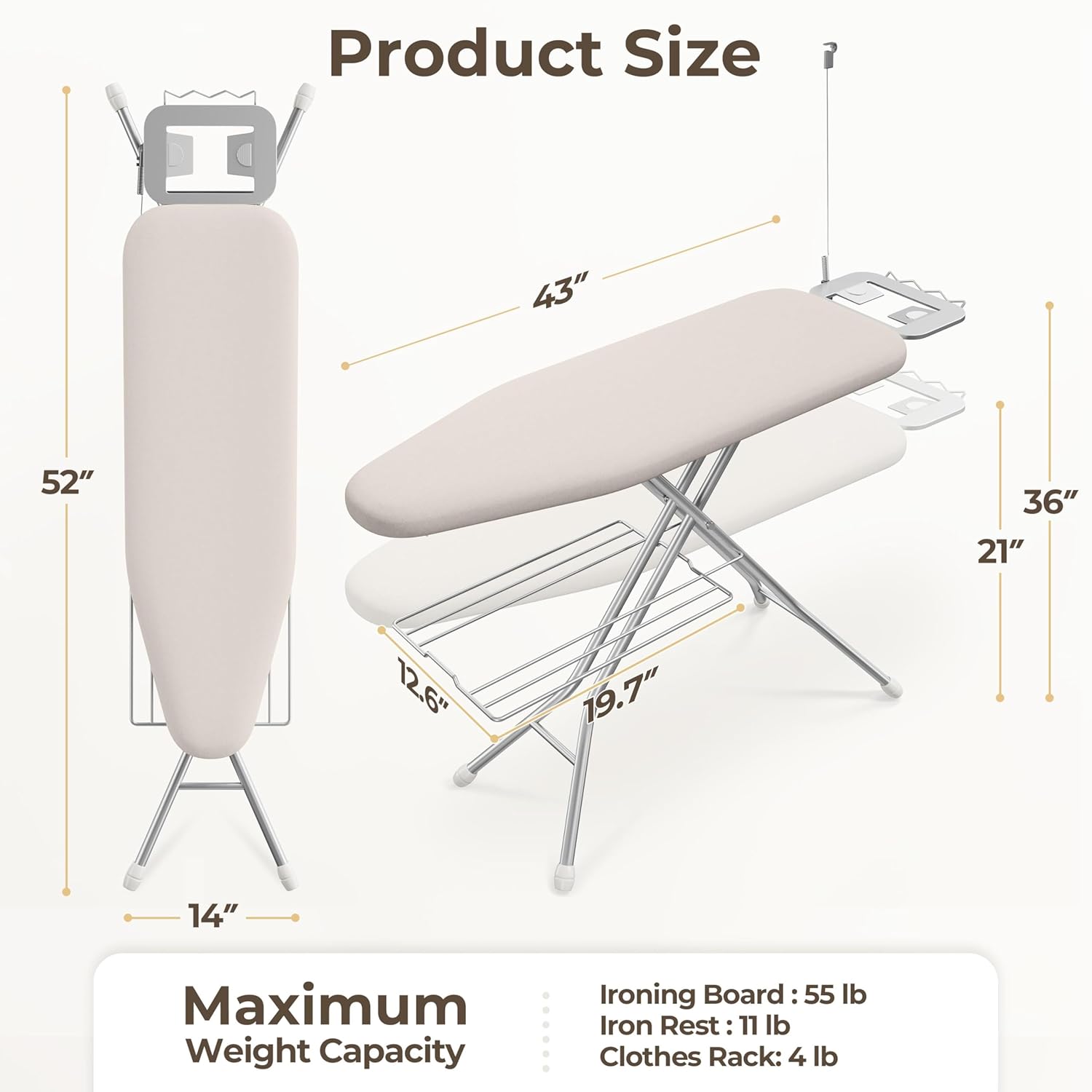 • Full-size Ironing Board: The iron stand provides ample space to meet all your ironing needs. The 43″ L× 14″ W surface ensures an efficient ironing and sewing experience and is ideal for larger garments