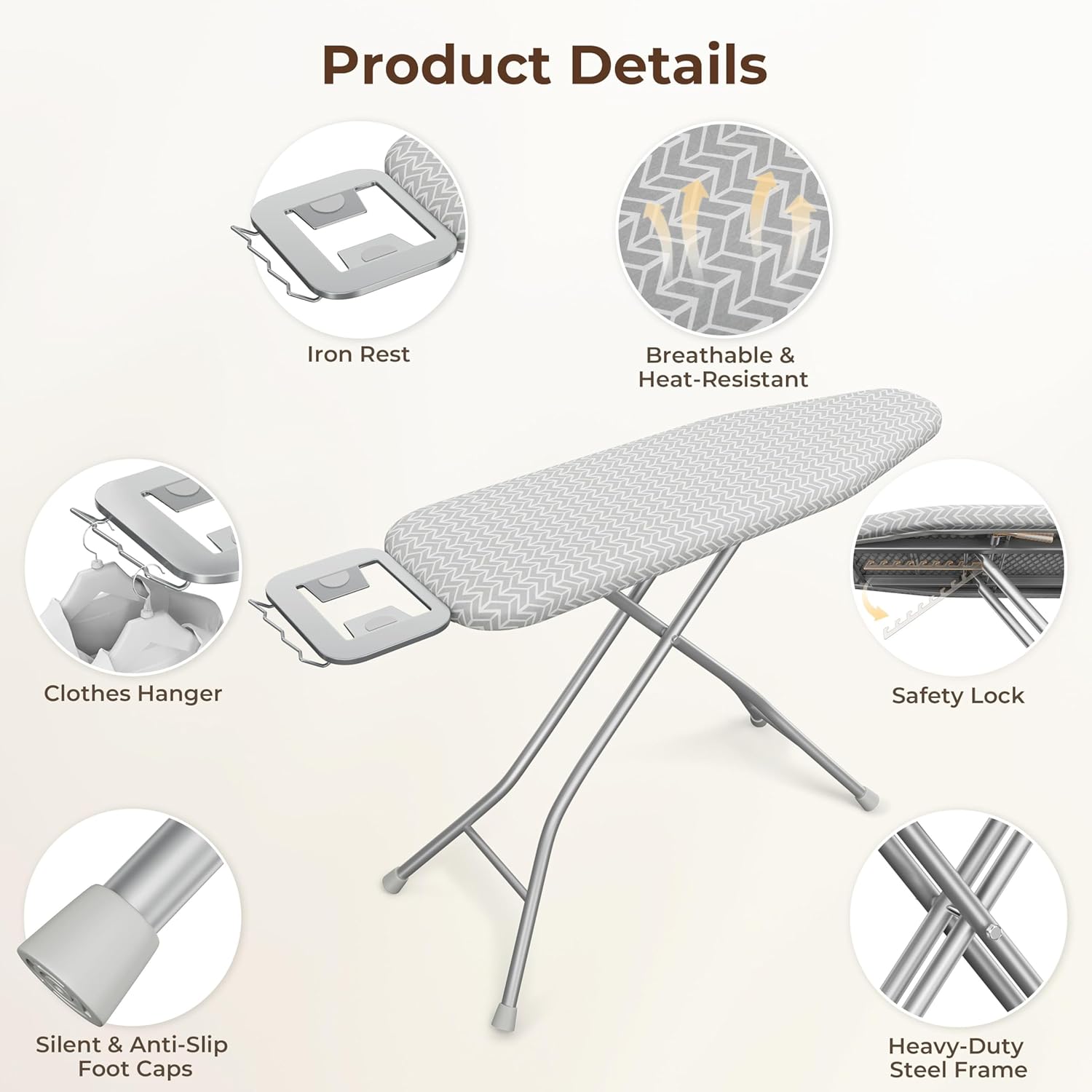 • Spacious Ironing Surface: This full-size iron board with a 43″ L × 14″ W surface offers ample space for ironing various garments and sewing, providing a smooth working experience to fulfill all your needs