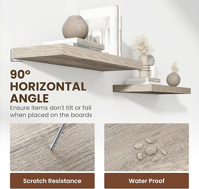 • 【Premium Quality Construction】Crafted from high-grade engineered wood with an invisible one-piece bracket, these floating shelves offer a robust and sleek design. The rustic wooden grain finish not only adds a touch of elegance but also infuses warmth into any room, making them a perfect fit for both modern and traditional interiors.