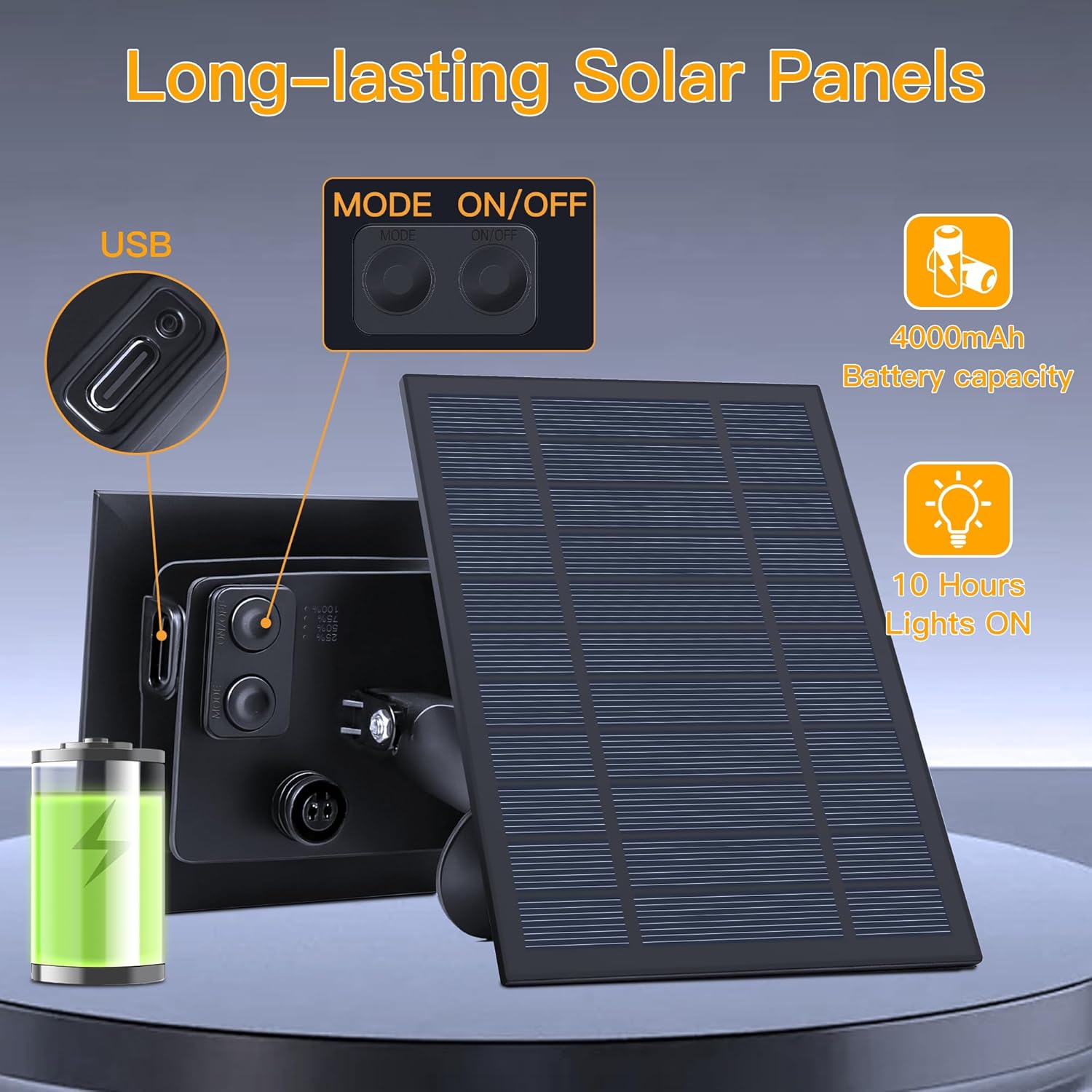 • [Auto ON/OFF Function] The solar panel features a built-in light sensor, enabling lights to automatically switch on at dusk and off at dawn. Key notes: 1. Press the ON button located behind the solar panel before initial use; 2. Ensure the solar panels are covered if used during daylight hours