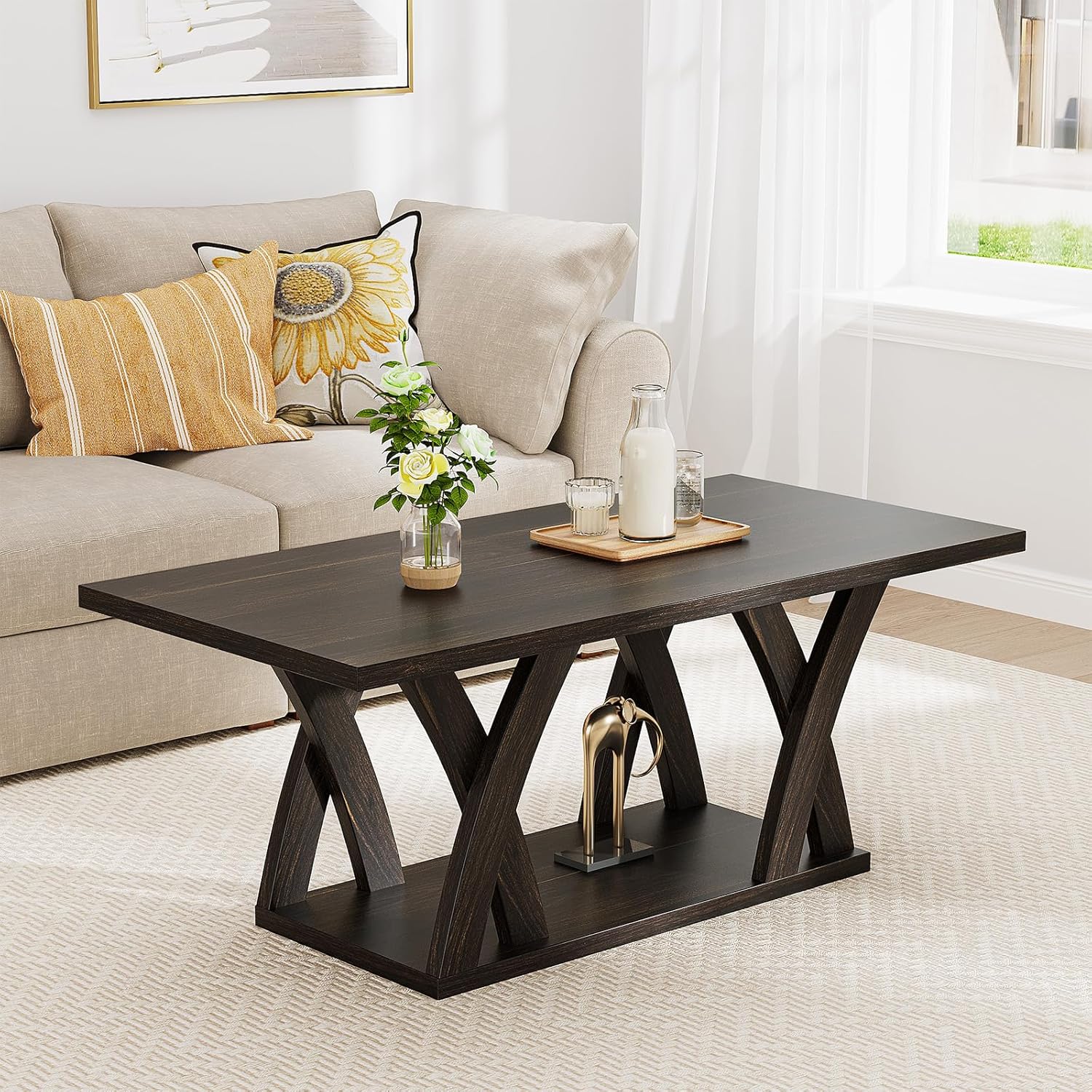 • 【Stylish and Functional Coffee Table】 This coffee table features a rectangular design with a modern touch, making it perfect for wood coffee tables for living room or as a mesa de centro para sala. Its coordinated colors and sleek X-shaped base blend effortlessly into various styles, whether as a Farmhouse Coffee Table with Shelf or a centerpiece in a traditional setting. The brown coffee table design adds a timeless elegance to any space.