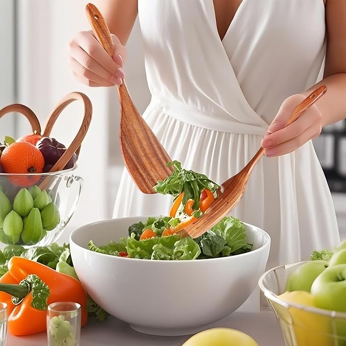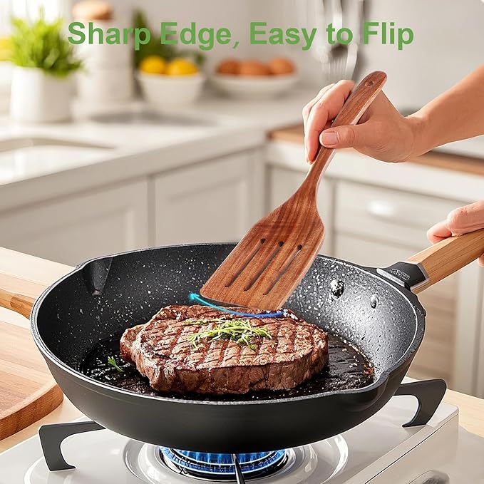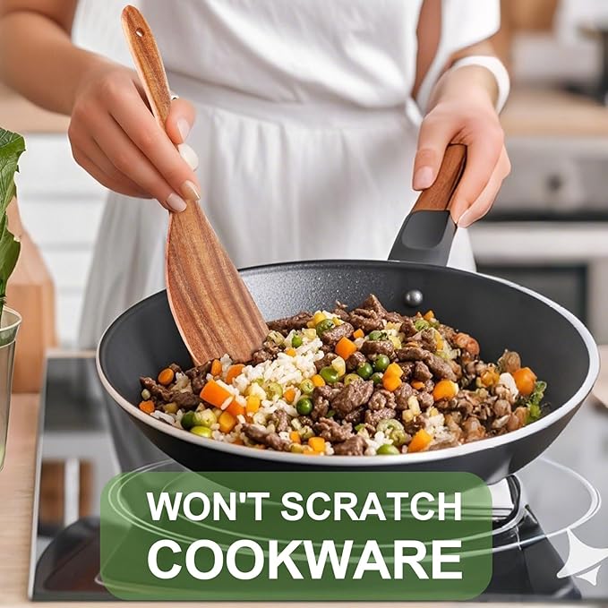 • NON-SCRATCH & HEAT RESISTANT: These wooden spatulas are gentle on the surfaces of your non-stick pans and other cookware, ensuring they do not scratch or damage them. Our wooden cooking spoons do not conduct heat efficiently. This makes them exceptionally safe to handle even at high temperatures, allowing you to stir, flip, and serve with confidence without concerns about burns or heat transfer.
