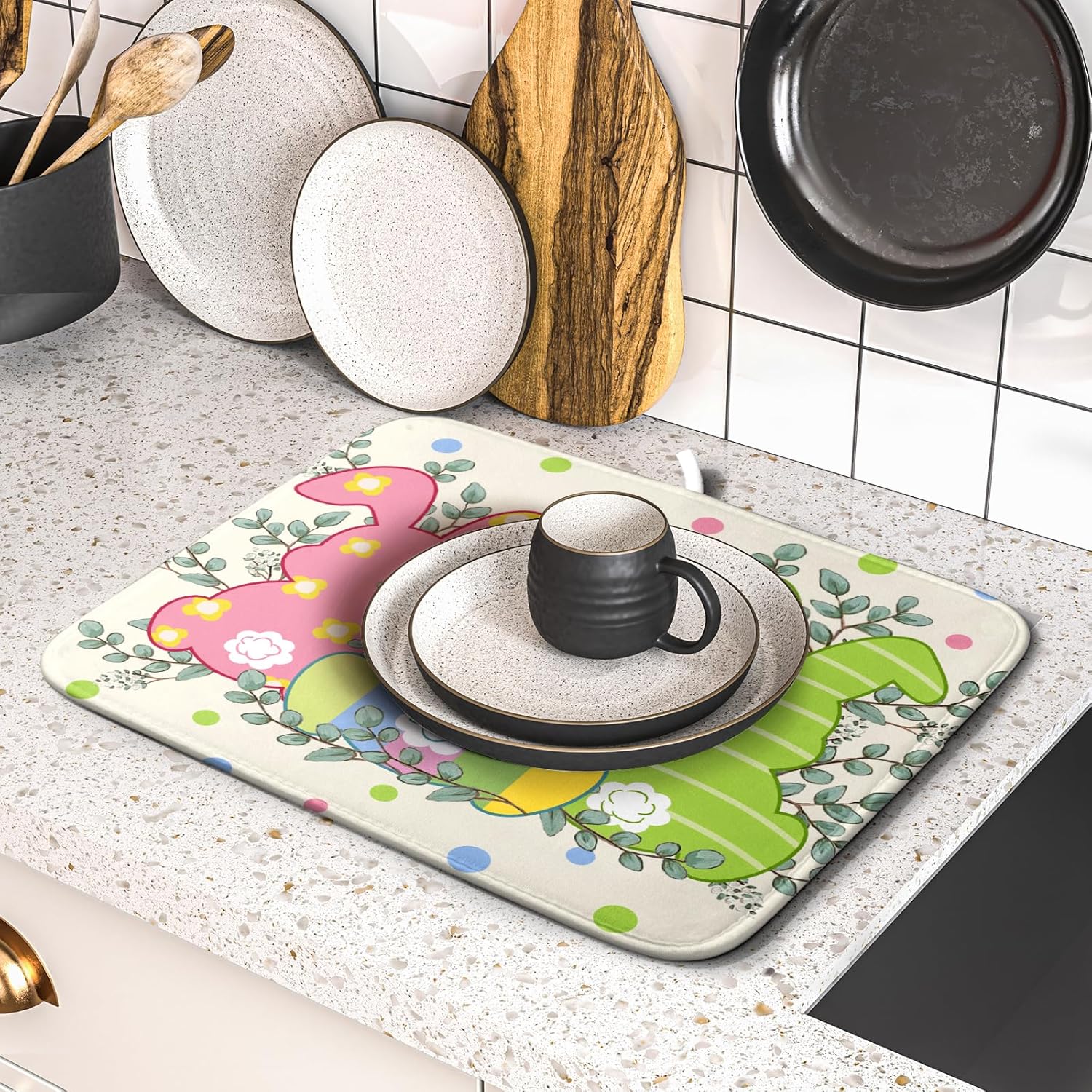 • 【Perfect Size】This Easter dish drying mat measures 16 x 18 Inch. Fits most kitchen countertops,while providing a smart,sharp look.