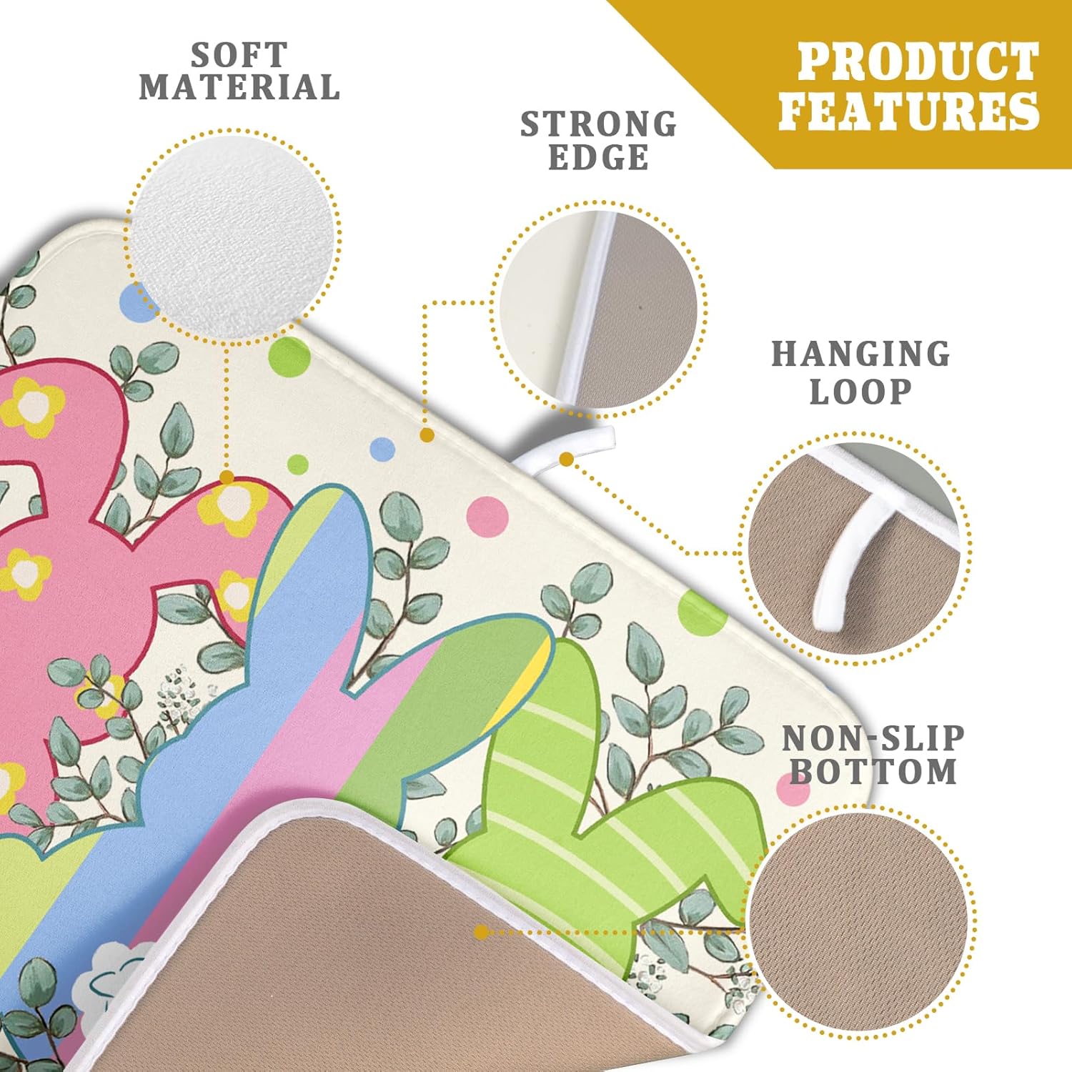 • 【Absorbent】The Easter dish drying mat is a 3-ply design made of absorbent microfiber, composite sponge, and cotton sateen fabric, the dish drying pad absorbs 4X its weight in water. Perfect for air-drying dishes, glasses, pots, pans, bottles, fruits, and vegetables