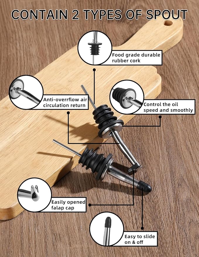 • Two Controlled Pouring Spouts - 18/8 Stainless steel pour spouts with sealed cap or flap cap, fit the bottle well and keep dust out. The pouring fluid is smooth without sticking and can easily dispense the right amount of oil for a healthy diet.