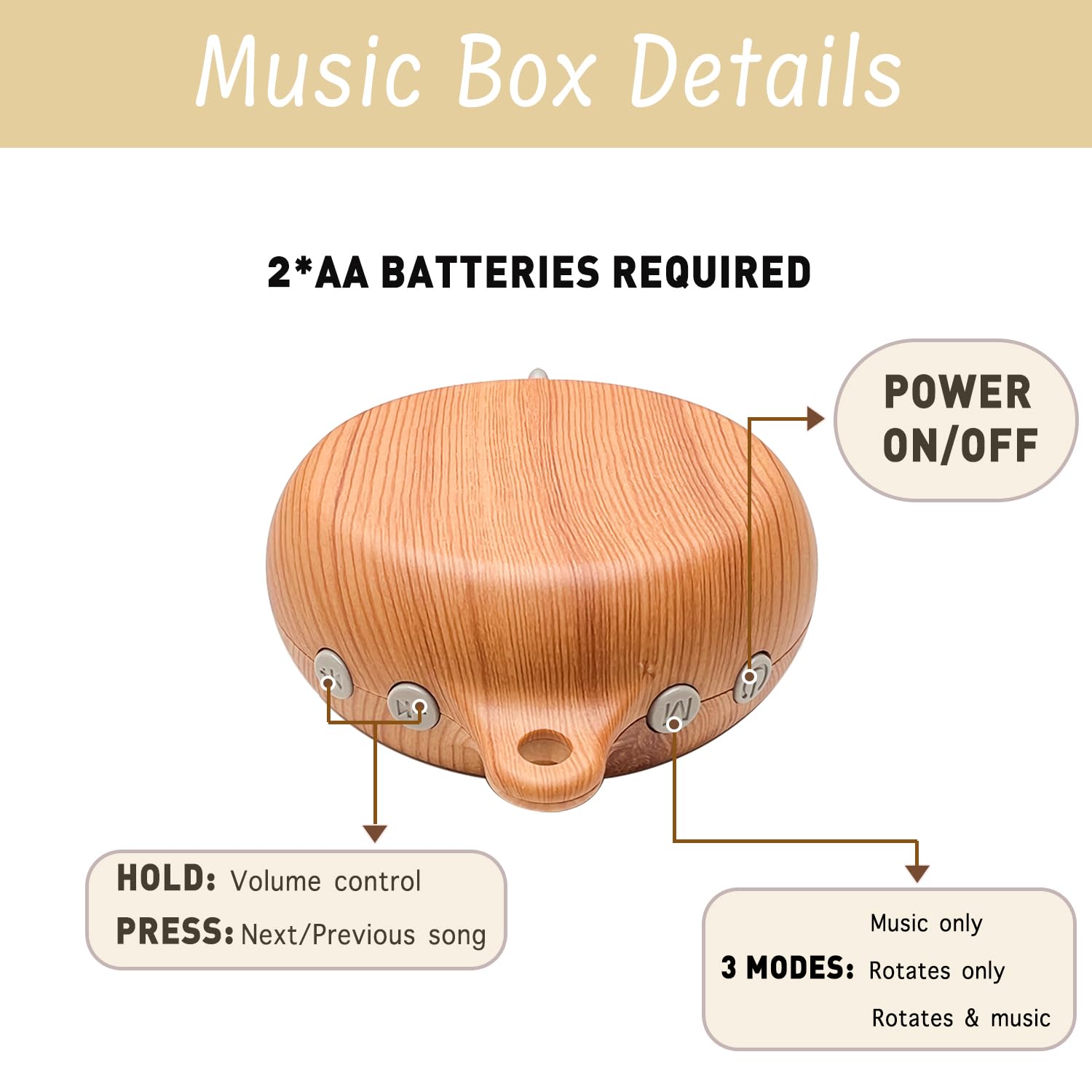 • 【About Music Box】This music box is made of non-toxic, durable ABS material for baby's safety. It offers 12 different lullabies, creating a harmonious and relaxing atmosphere to help babies unwind quickly. Equipped with four buttons – power, M, and two volume buttons. The M button switches modes. Press and hold volume buttons to adjust volume or short press to change songs. Volume is freely adjustable. Three modes available: rotation only, music only, and rotation with music. Automatically shuts off after 30 minutes to save power. Requires 2 AA batteries (not included).