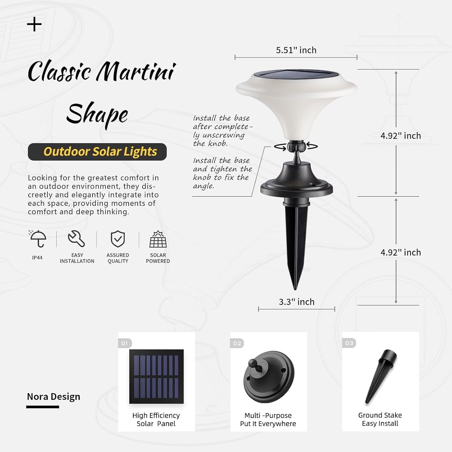 • Classic Martini-shaped Design - Transform your outdoor space with our uniquely designed solar pathway lights featuring a sophisticated martini cup silhouette. The premium shade creates a soft, atmospheric warm white glow, while the adjustable head allows you to direct light where needed. Perfect for creating captivating lighting effects that enhance your garden's nighttime ambiance.
