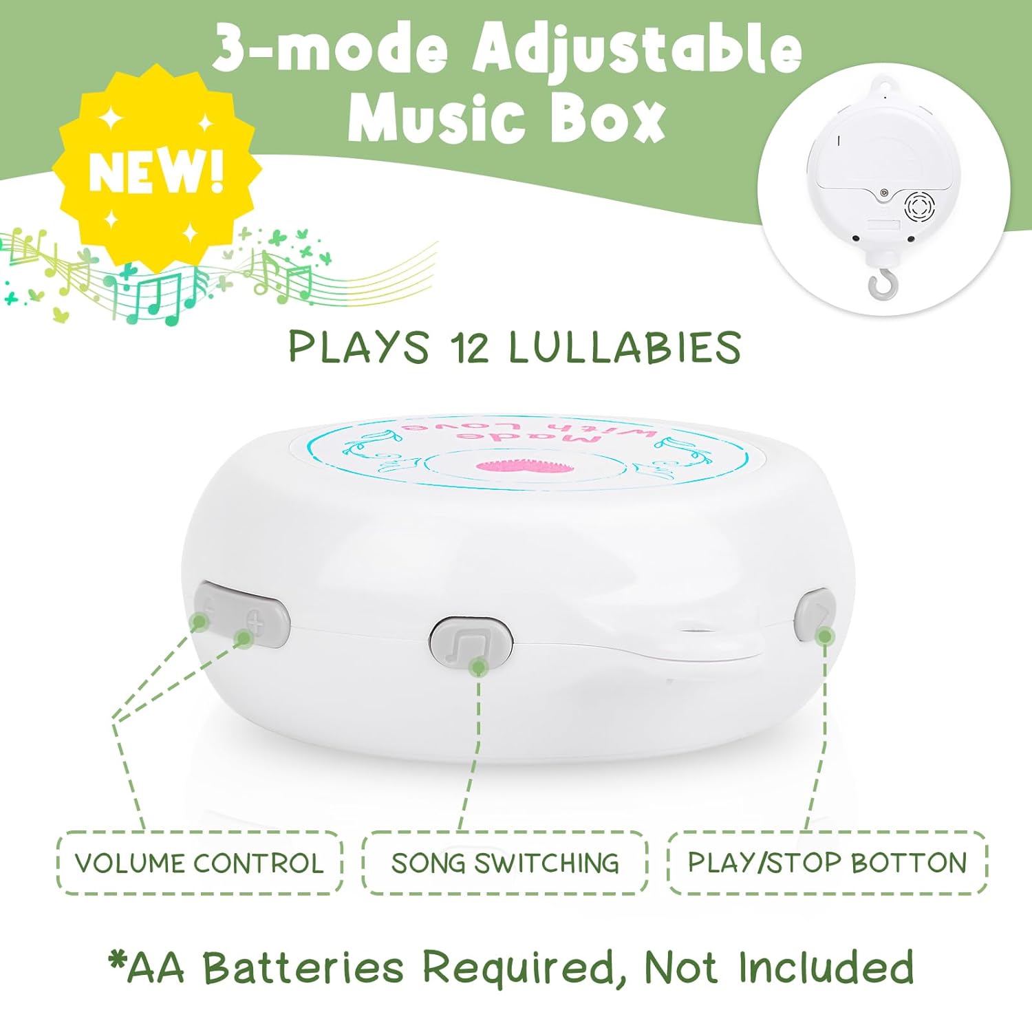 • 12 Soothing Lullabies: The newly upgraded 3-mode adjustable music box lets you choose between Rotation Only, Music Only, or Both. As the gentle melodies play, the toys slowly spin, creating a calming atmosphere that makes bedtime a smoother and more enjoyable experience for both baby and parents