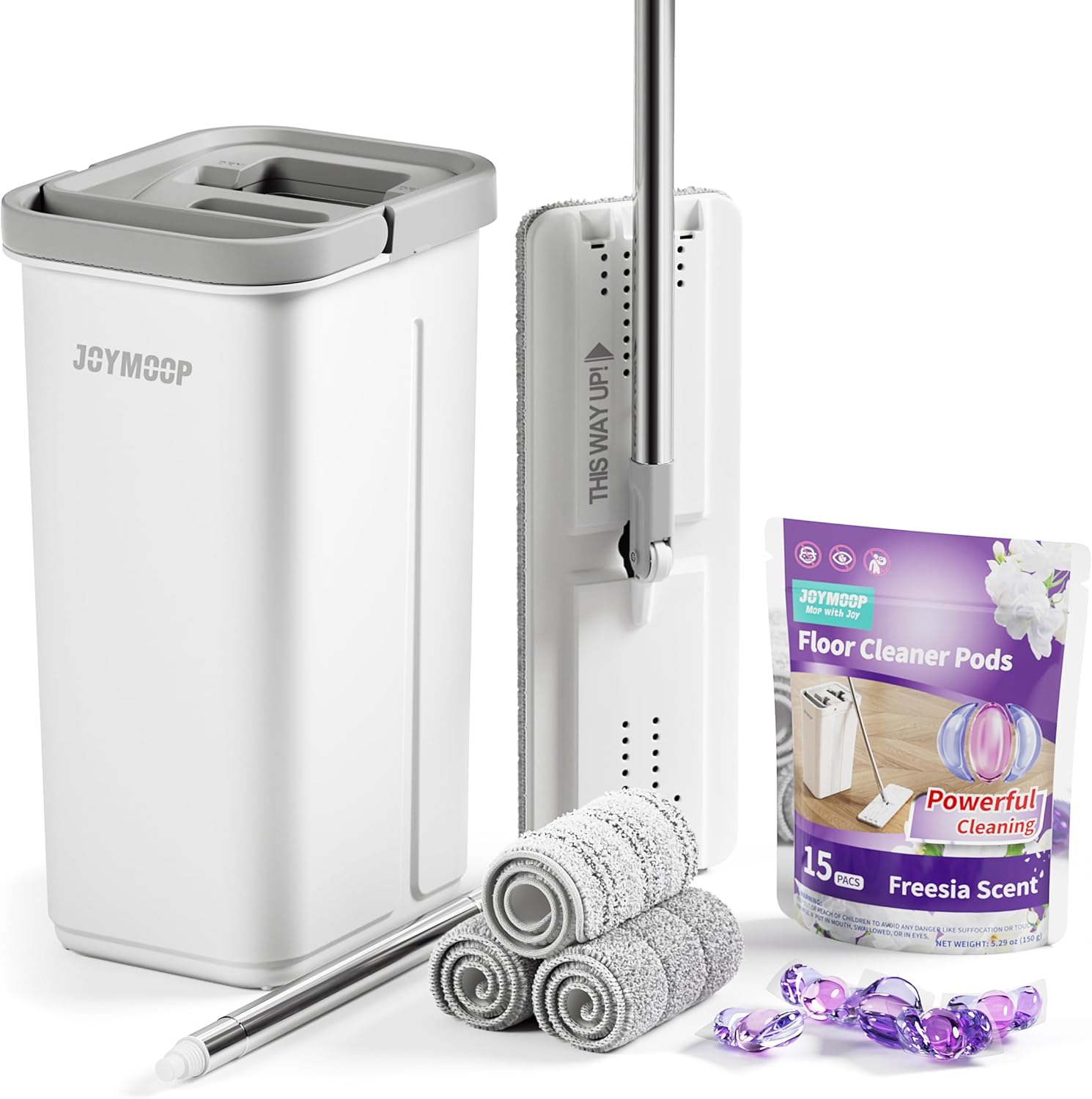 • [ALL-IN-ONE CLEANING SOLUTION] Bundle includes a JOYMOOP flat mop and bucket with wringer, plus 15 floor cleaner pods in freesia scent for an ultimate cleaning experience