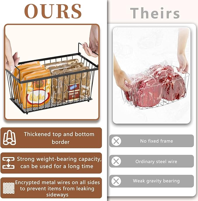 • Thickened Frame and Four-Sided Metal Mesh: Our chest freezer organizer bins are made of high-quality metal, with reinforced and thickened upper and lower frames and dense metal mesh design on all four sides, providing stronger load-bearing capacity and resistance to deformation. Therefore, this chest freezer organizer is more durable compared to regular models.