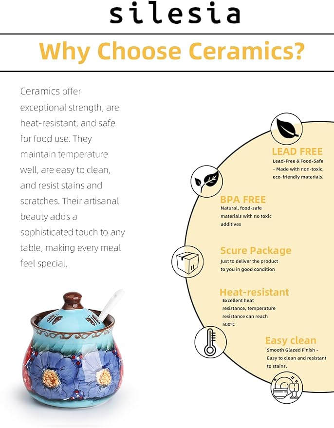 • Beautiful Hand-Painted Design: The sugar bowl features a unique, hand-painted design, showcasing vibrant colors and intricate patterns. This artisanal touch adds charm and character, making it a perfect decorative piece for your kitchen or dining table. Each piece is slightly different, reflecting the craftsmanship behind it