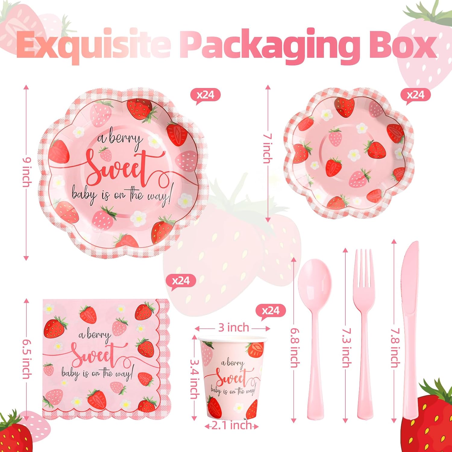 • 【Strawberry Baby Shower Decorations】- Strawberry party decorations include 24 9 inch strawberry baby shower plates, 24 7-inch strawberry paper plates, 24 girl baby shower cups, 24 girl baby shower napkins, 24 sets of pink plastic utensils (forks, spoons, knives), 168pieces in total. This is a great strawberry plates and napkins party supplies.