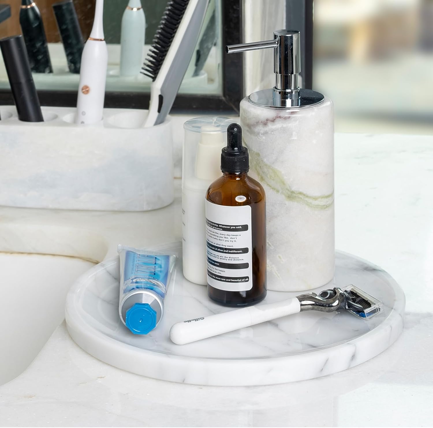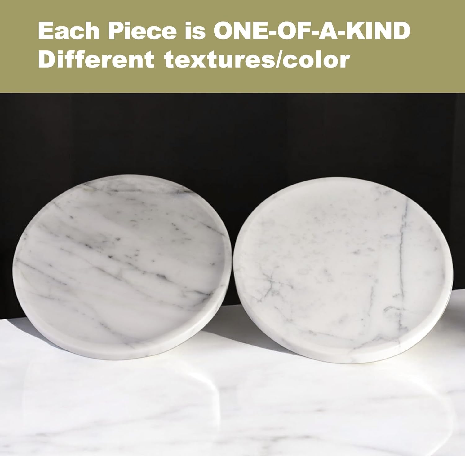 • Suitable Size: Our small round marble tray measures D9.8”x H0.7”. This bathroom counter tray fits bathroom washstands, kitchen counters, coffee tables, bedroom dressers, vanity tops, and bedside tables—ideal for organizing and enhancing your space
